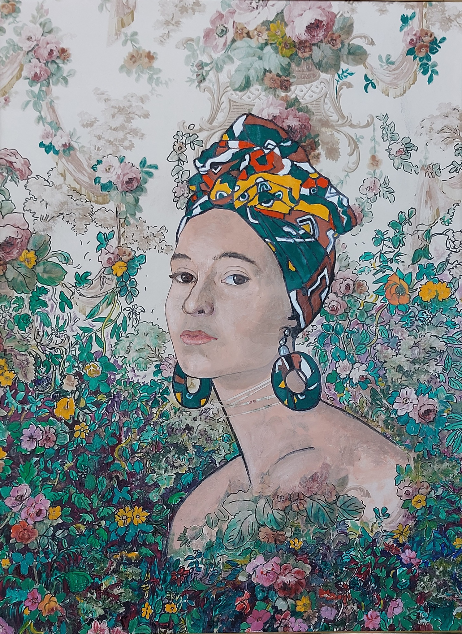 Een portret van Beatriz geteekend en geschilderd op een stuk oud behang met een ouderwets romantisch rozenmotief. Ik heb aan de onderkant de rozendecoratie feller, kleurrijker en exotisch gemaakt, in antwoord op de doek en oorbellen van Beatriz.