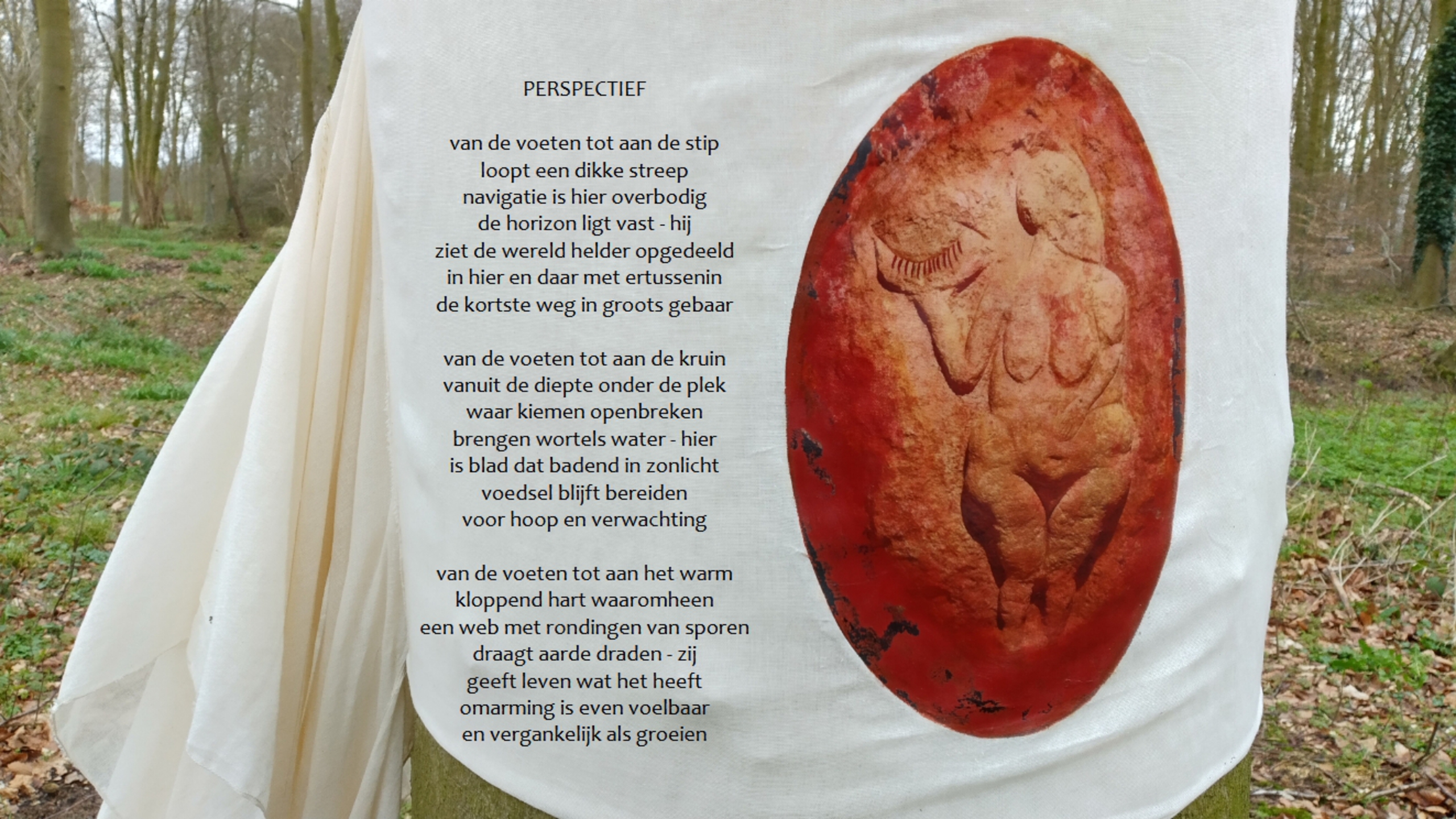 Voor de kunstwandelroute Hummelo maakte Catharina Aaldering Een Vrouwelijk (ge)Zicht, een installatie van 16 oervrouwbeelden bij een zichtlijn op het landgoed Enghuizen. Zo onderzoekt zij vrouwelijk perspectief in een wereldgeschiedenis die door de mannelijke zienswijze wordt gedomineerd. Ik schreef er het gedicht PERSPECTIEF bij. De foto toont een van de 16 doeken die Catharina in 4 bomen installeerde als toegangspoort tot de zichtlijn.