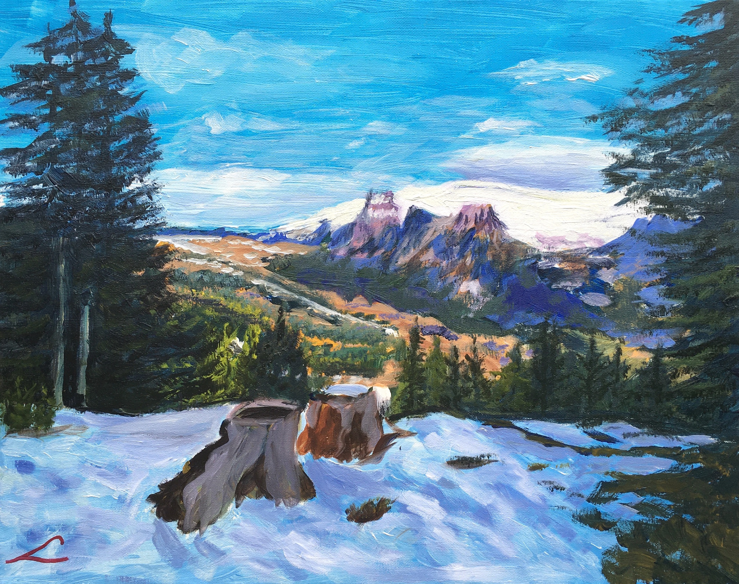 Een olieverfschilderij toont een met sneeuw bedekt berglandschap met drie prominente toppen aan de horizon onder een lichtblauwe lucht. Op de voorgrond is een oude boomstronk te zien, omgeven door sneeuw. Naaldbomen, gedeeltelijk bedekt met sneeuw, zijn aanwezig in het tafereel, wat bijdraagt aan de winterse sfeer. De kunstenaar heeft impasto-penseelstreken gebruikt om de vormen en texturen in het schilderij te creëren.