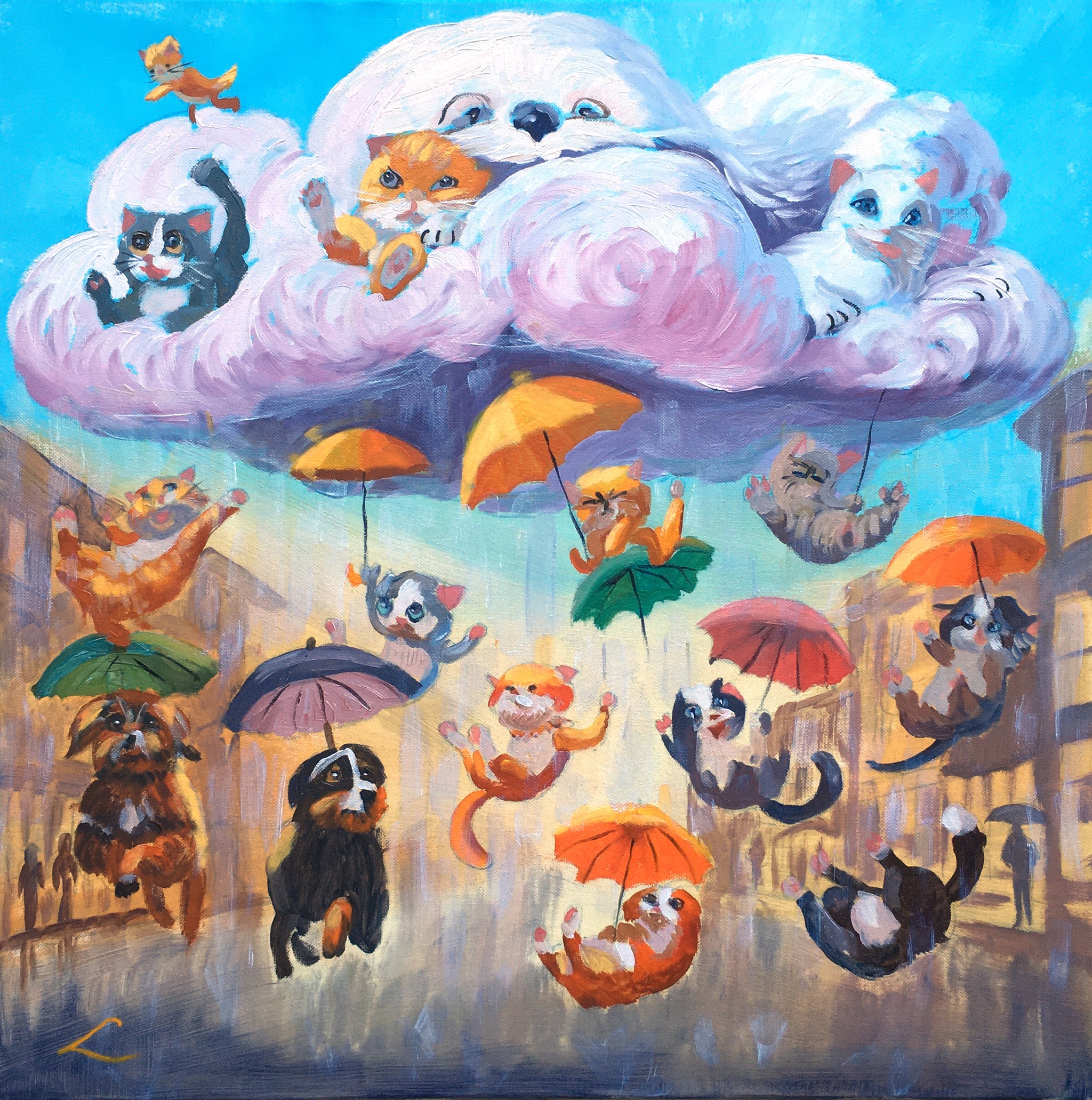 Een olieverfschilderij toont talloze katten en honden die te midden van een grote, weelderige grijze wolk tegen een helderblauwe lucht vliegen. Ze dragen allemaal een paraplu in verschillende kleuren, zoals rood, geel, paars, oranje, groen en blauw, wat bijdraagt aan de levendigheid van de scène. De katten en honden zijn in verschillende posities door de lucht verspreid, sommige vliegen hoger en dichter bij elkaar, terwijl andere meer verspreid en lager zijn, waardoor diepte in het kunstwerk ontstaat. Beneden staan afbeeldingen van veelkleurige gebouwen langs een drukke straat vol figuren, wat een stedelijke omgeving suggereert. De straatactie is geanimeerd en tussen de uitbundigheid is een wolk gevormd uit kattenfiguren zichtbaar boven het levendige tafereel. De algemene indruk is er een van eigenzinnigheid, vrolijkheid en levendigheid, wat zorgt voor een fantastisch stadsbeeld.
