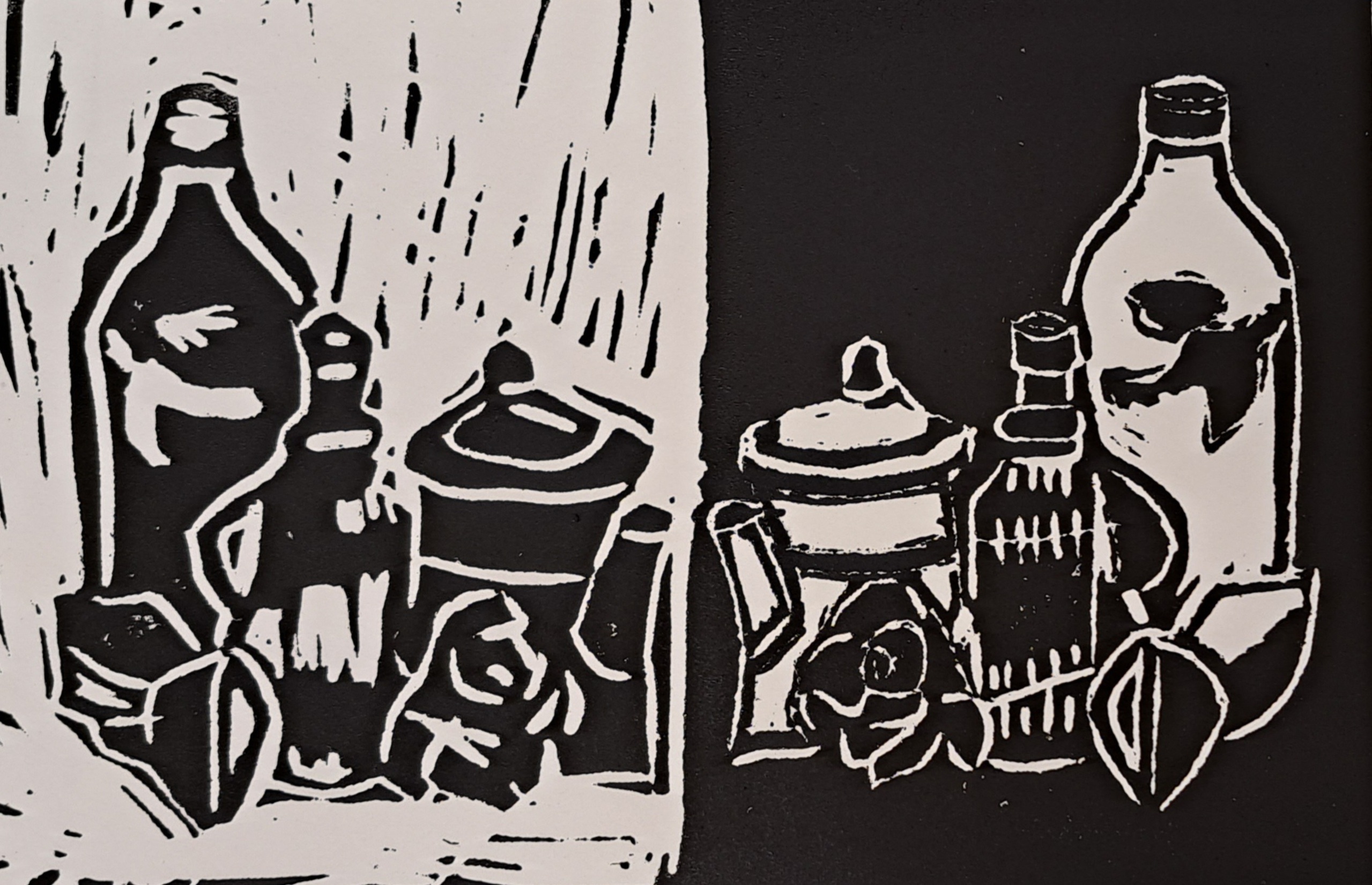 Stilleven in linosnede, positief en negatief tegenover elkaar.