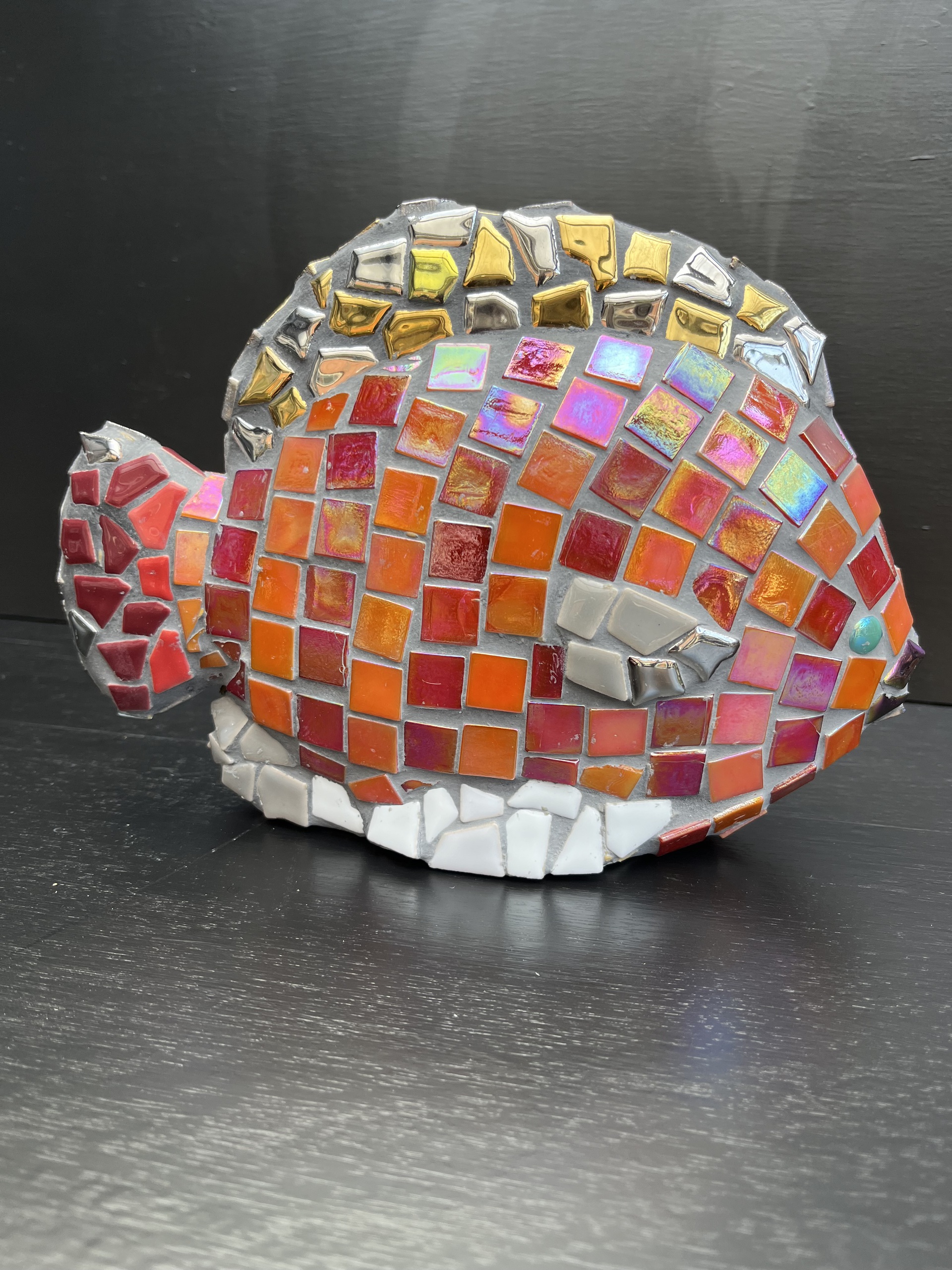 Vis beeld van keramiek bewerkt met keramische- en glas tegels.
