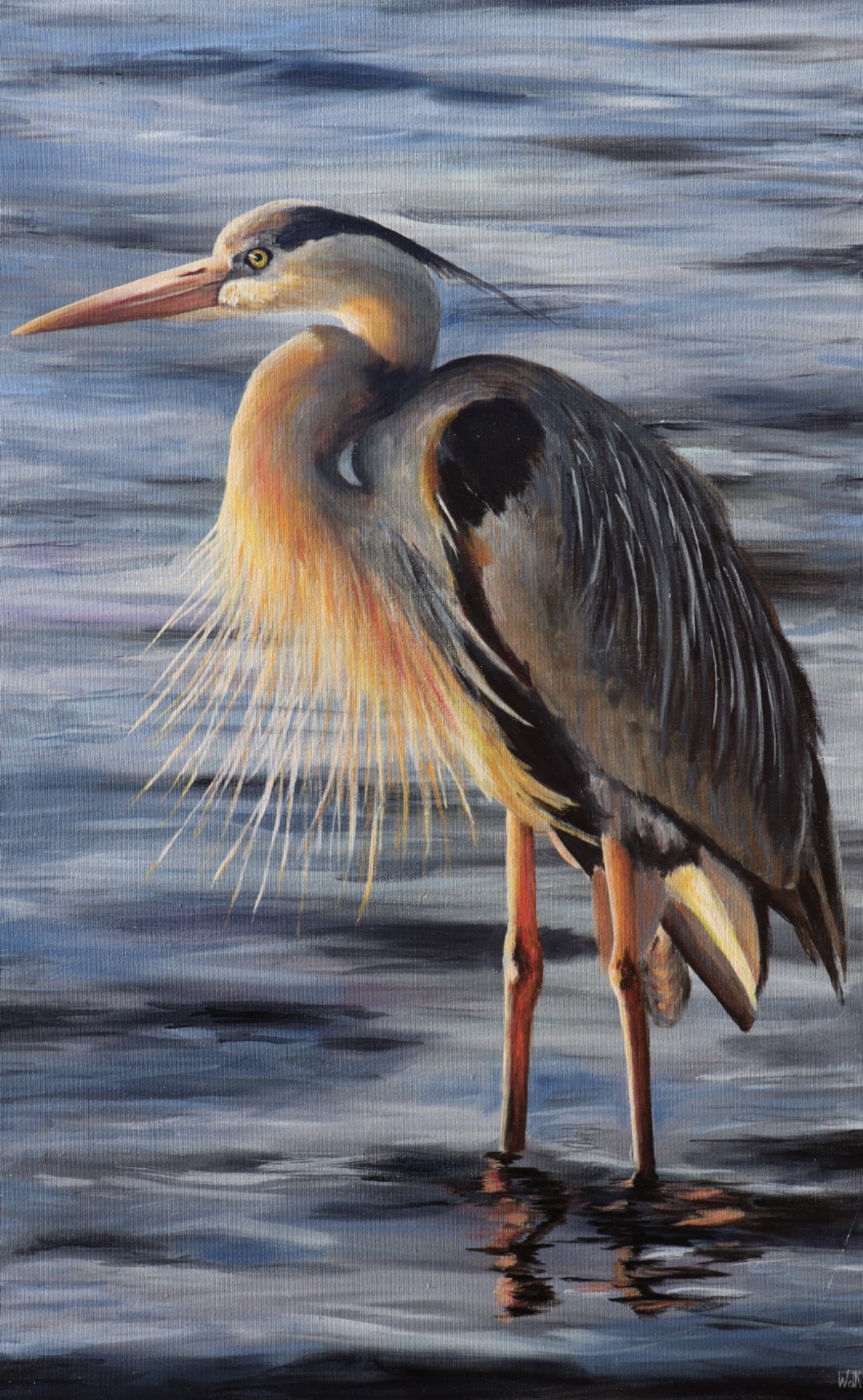 Blauwe reiger, olieverf op doek. 50cm breed x 80 cm hoog. zonder lijst, zijkanten meegeschilderd