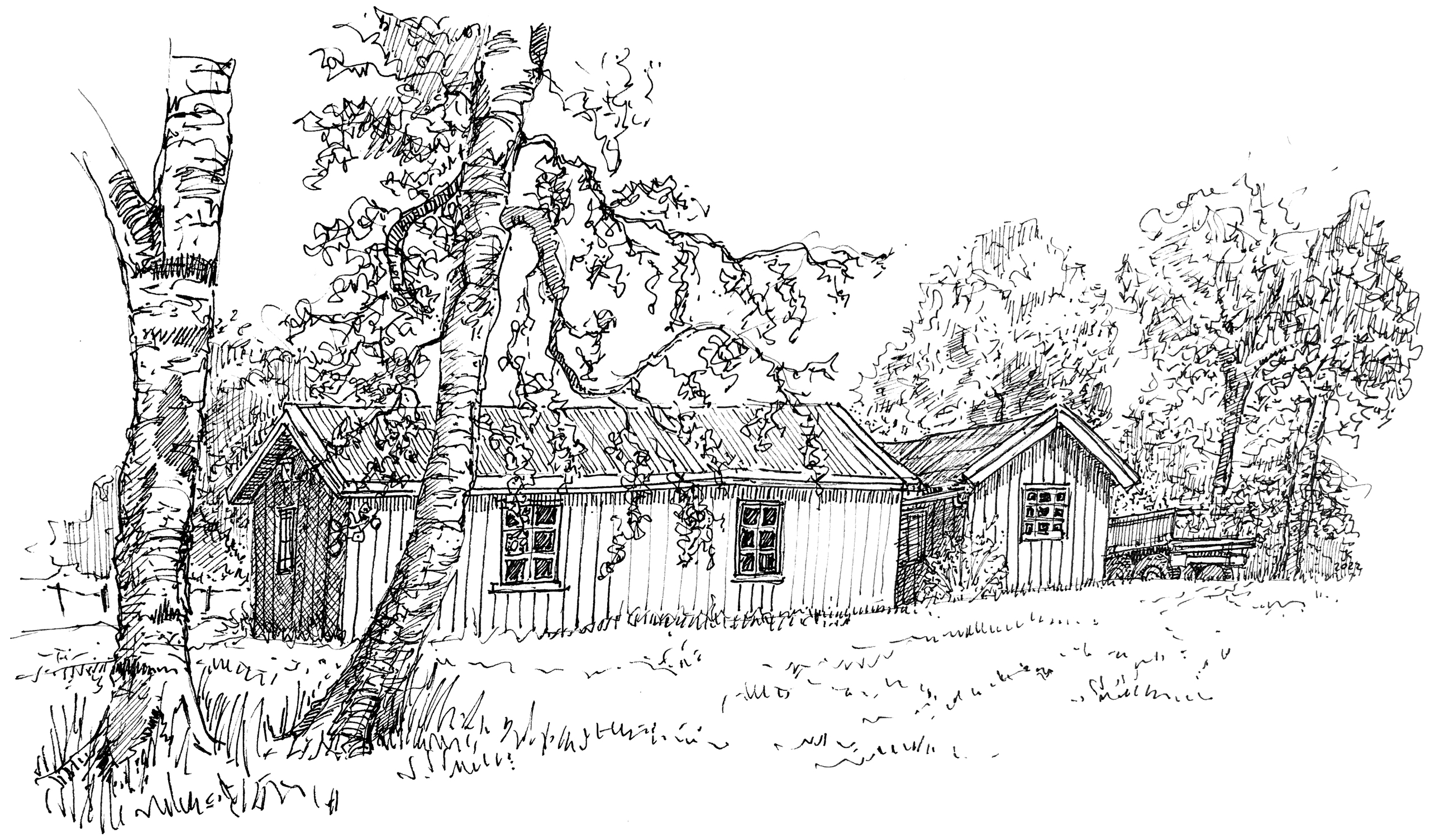 Pentekening Inkt Realistisch Hutten Noors Noorwegen Camping Bjorkhol Houten Stadsgezicht