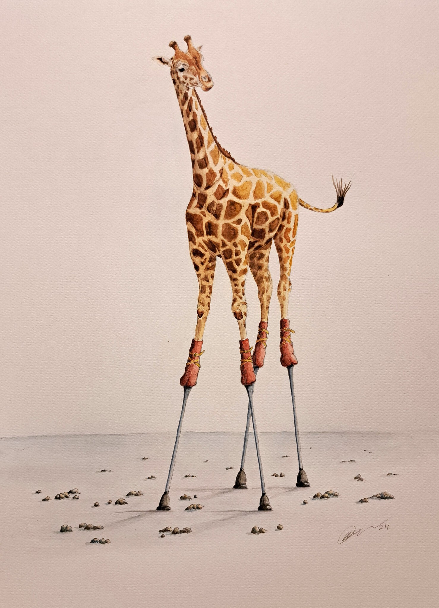 Het verhaal achter de Giraf op stelten is persoonlijk, heel persoonlijk. Ik heb mijn beperkingen, kan vanaf mijn 10e niet meer door mijn knieen vanwege reuma. Ik ben bang om te vallen, kwetsbaar, wankel. Ik voel mij als een giraf op stelten.