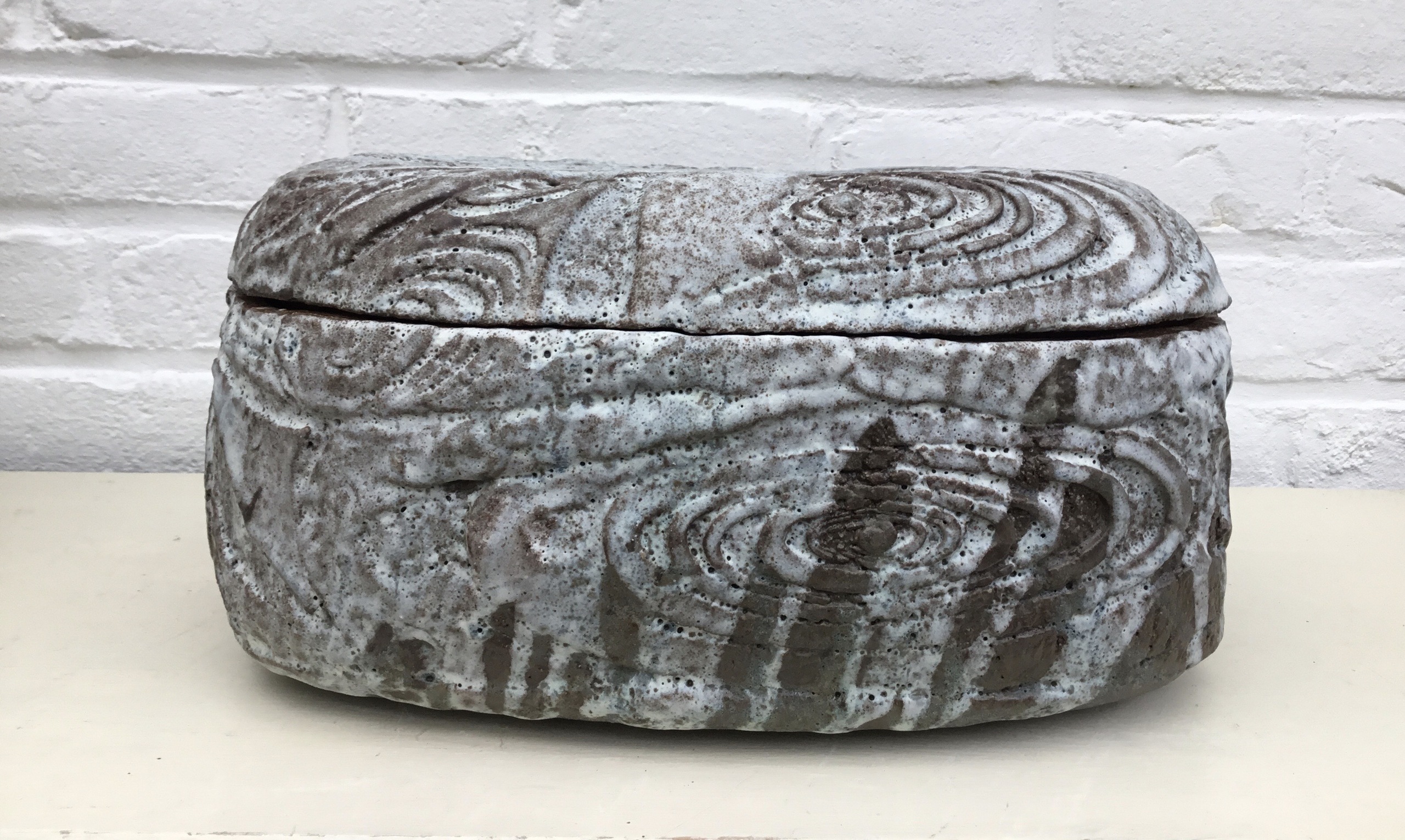 Steengoed - handvorm - witte asglazuur over donkerblauw gerecycled glazuur