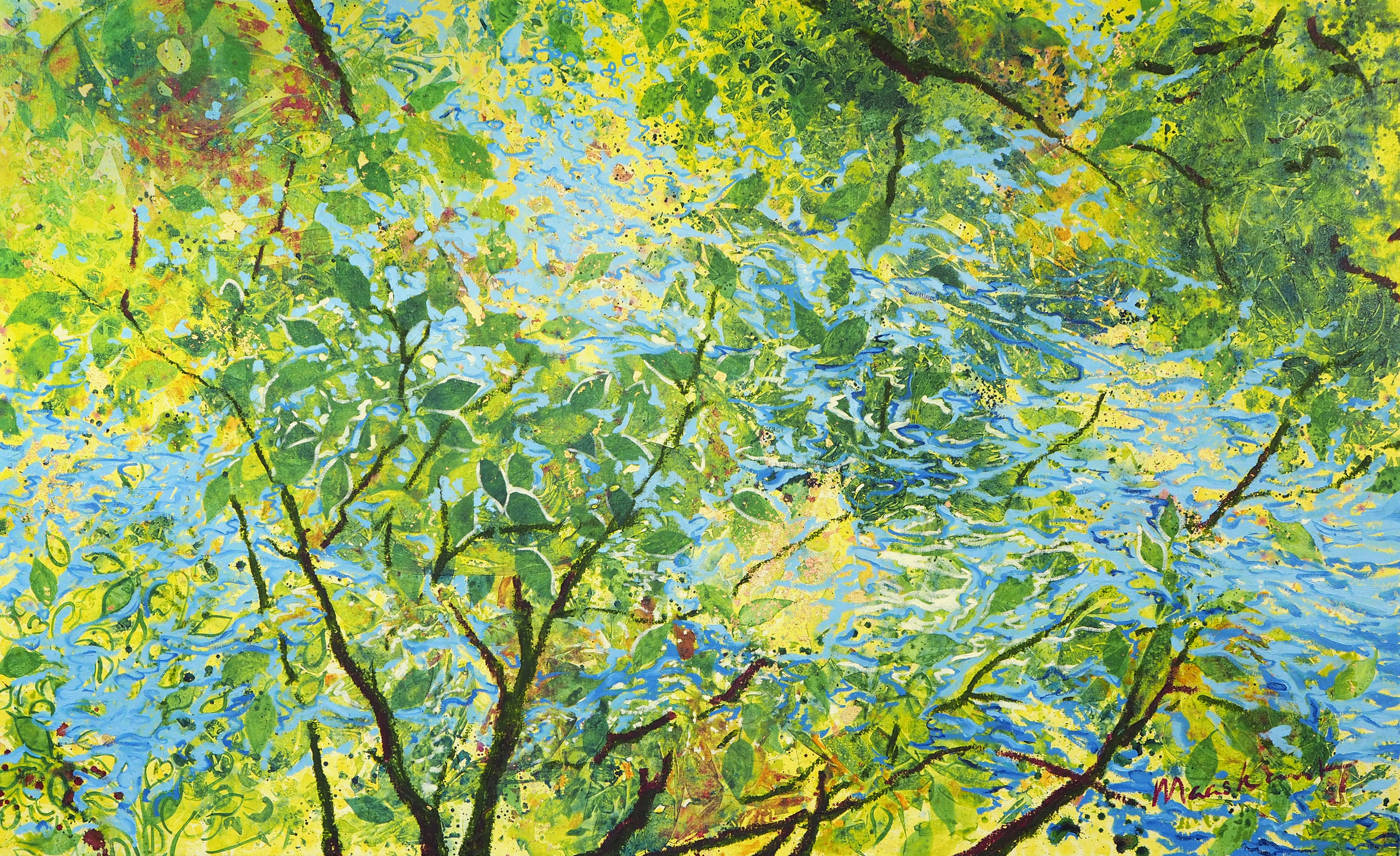 De lente gespiegeld in water. In dit schilderij heb ik het licht dat tussen een bladerdek door twinkelt willen vangen. Het bladgoud geeft dit schilderij letterlijk een twinkelend gouden licht. Dit schilderij is momenteel te zien bij Warnars & Warnars Artdealers in Haarlem. Als je het schilderij live gaat bekijken komt vooral het bladgoud pas echt goed tot z'n recht.