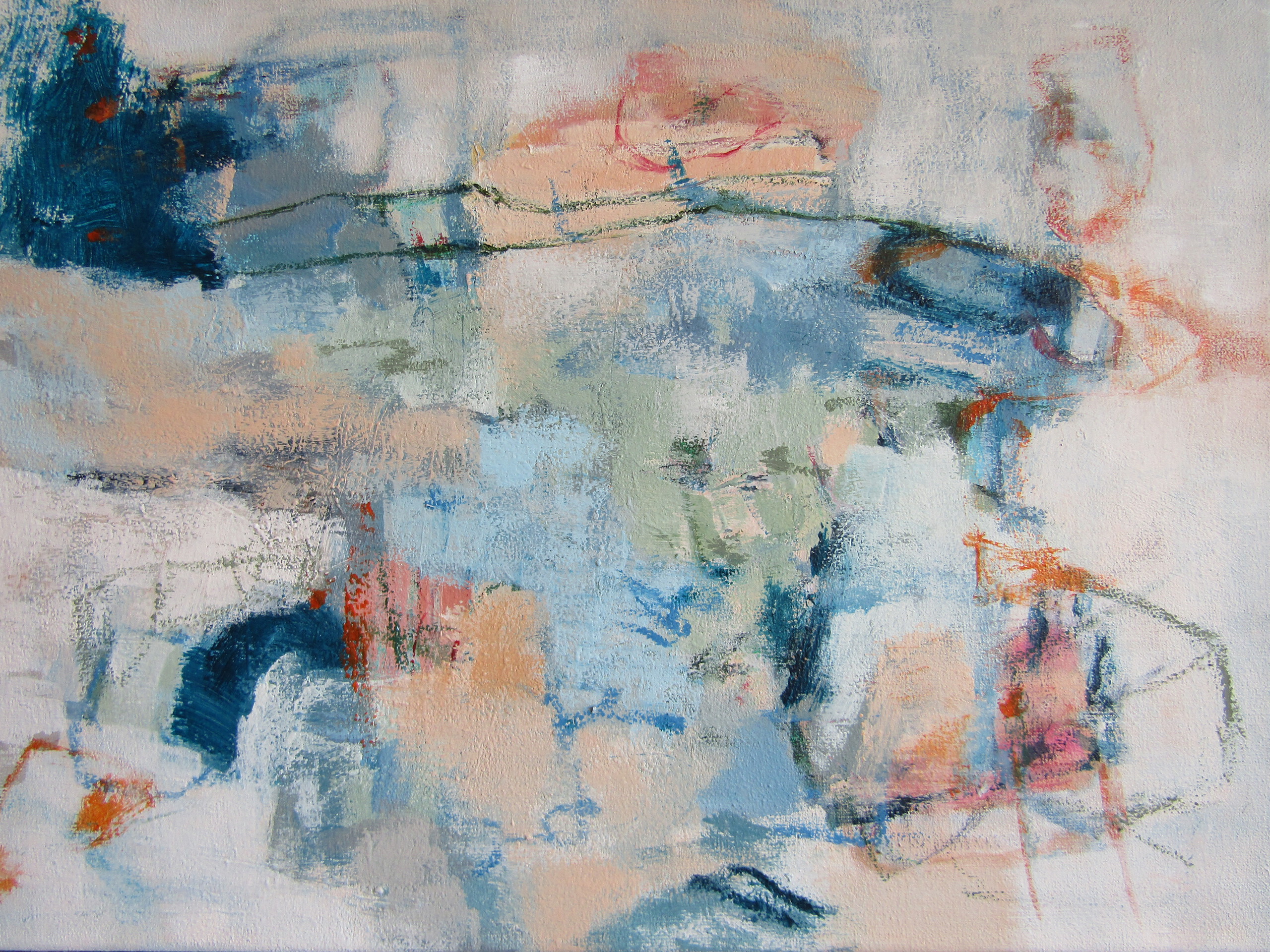 Blauwen Groen Zalm Roze Wit Abstract Landschap Landschappelijk Kleurrijk Zomers Acrylverf Interieurkunst Poëtisch Lyrisch Minimalistisch