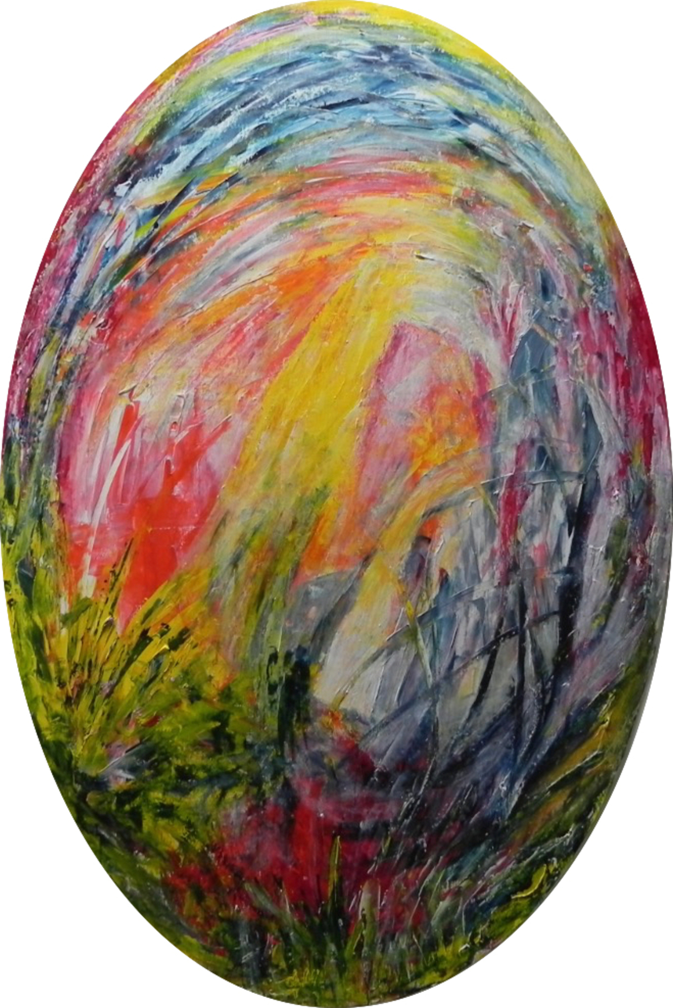 Wat verbergt zich achter het hoge gras, waar zijn we, waar kijken we naar? ... acrylverf op karton, ovaal, ca 118 x 83 cm