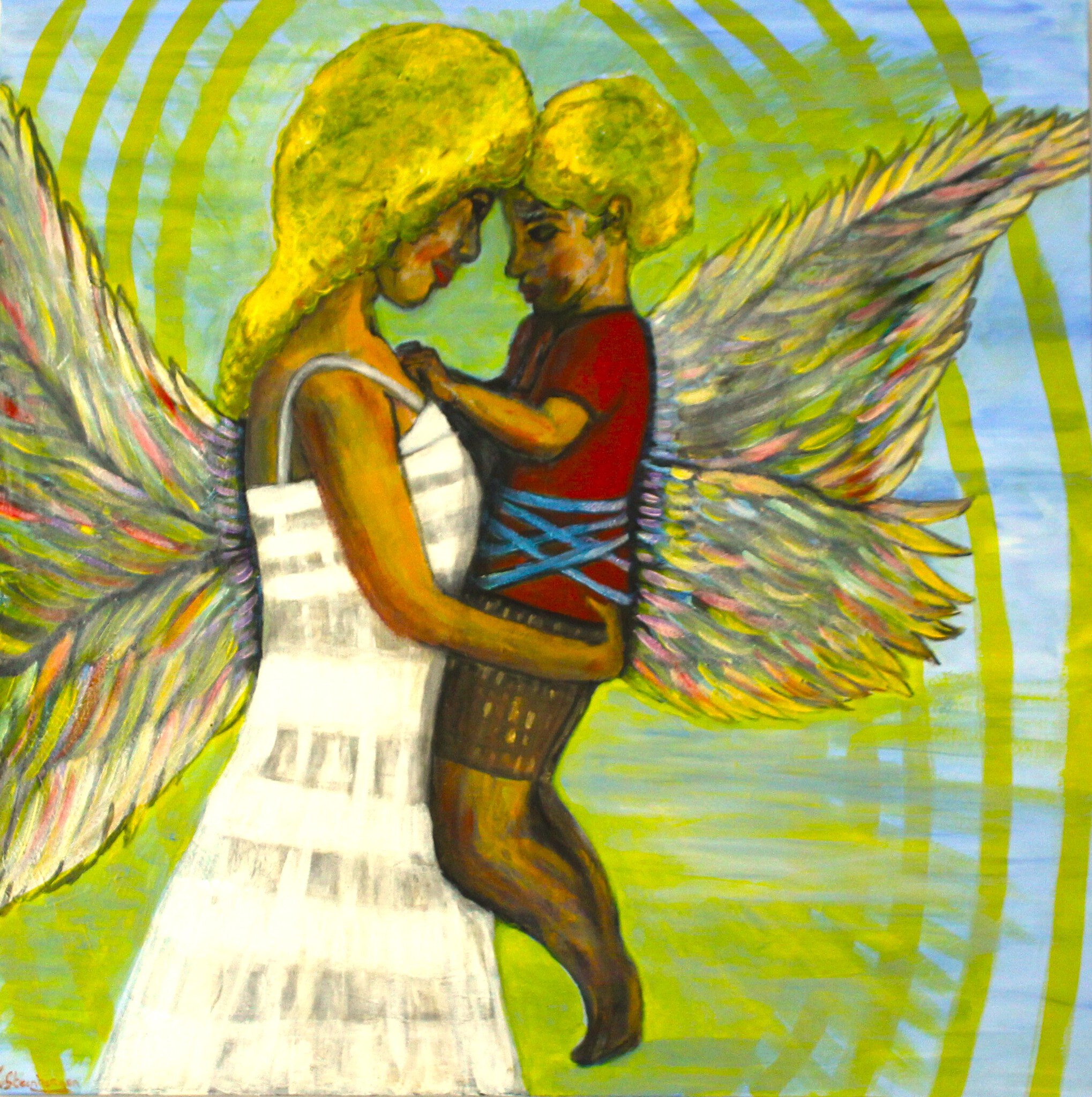 engelbewaarder vrouw jongetje acrylverf parelmoer 100 x 100 x 4 cm uniek nieuw