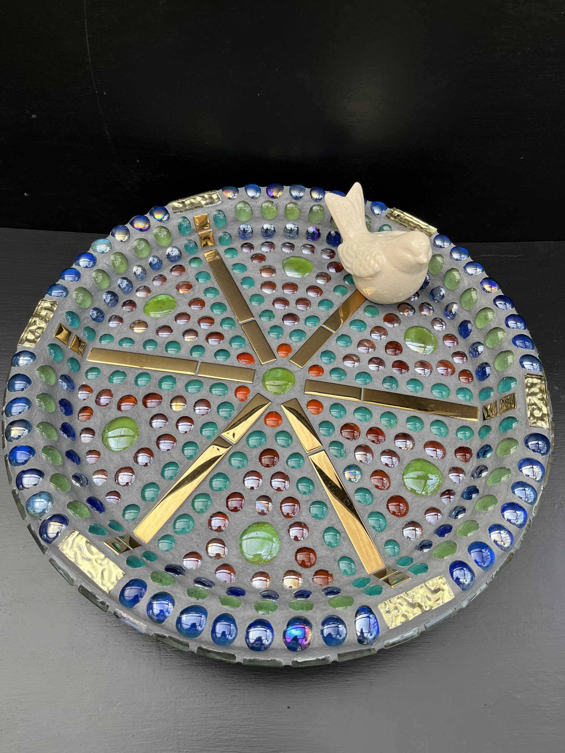 Terracotta vogelschaal op pootjes bewerkt met glas tegels en glas.