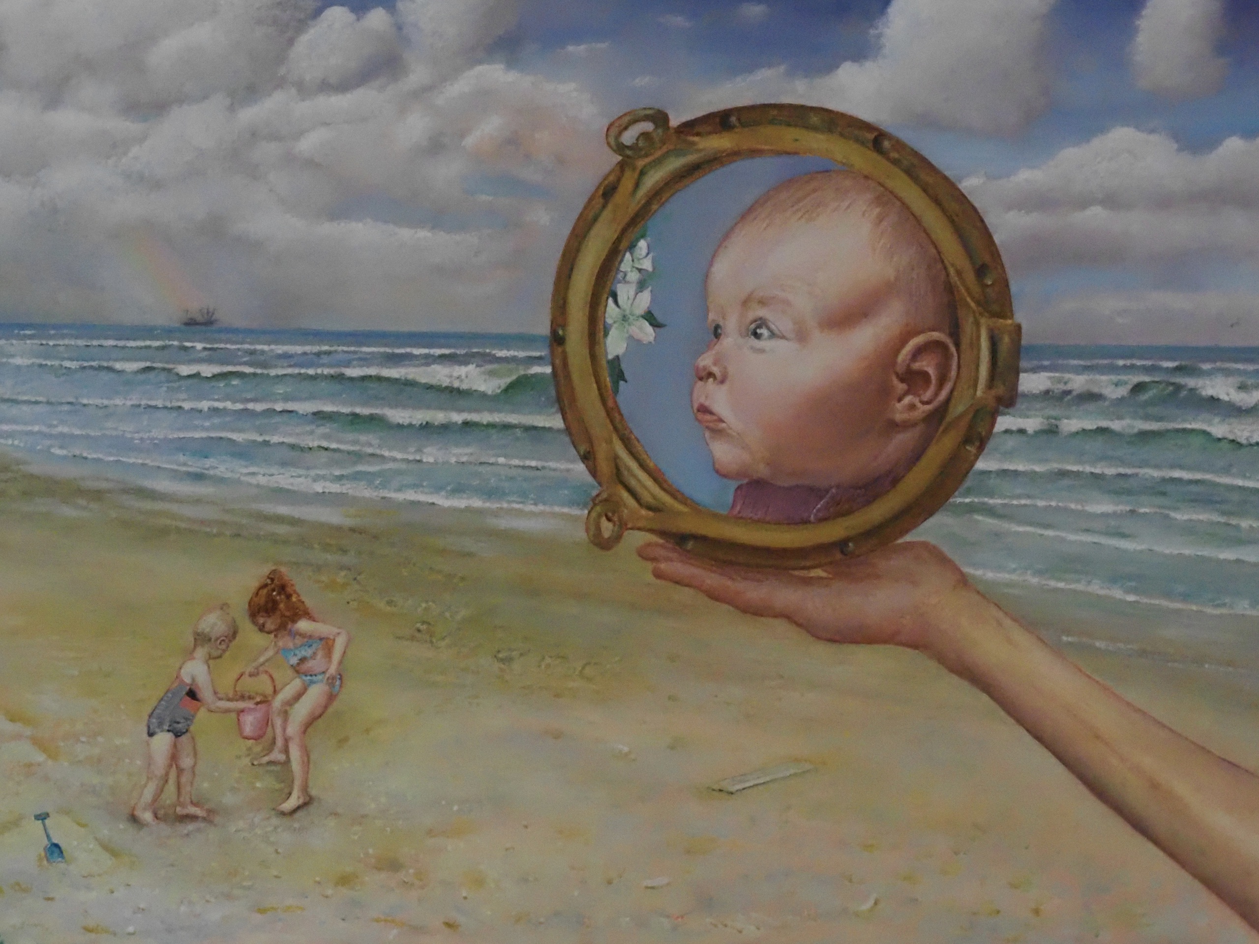 STRAKS. Later, Langs, Het water. Later, Als ik, Groot ben. Spelen, Water, Zand, Strand! Een heel jong kind kijkt met de verbaasde blik die bij deze leeftijd hoort, de wereld in. En kijkt door de patrijspoort naar de toekomst. Een patrijspoort die gedragen wordt door de arm van de moeder, symbool voor de zorgzaamheid van de ouders. Zal later vast, net als de zichtbare kinderen, graag langs de waterkant graven, spelen, knoeien. Is ook de wens voor de ouders en oma dat er een gelukkig leven volgt.
