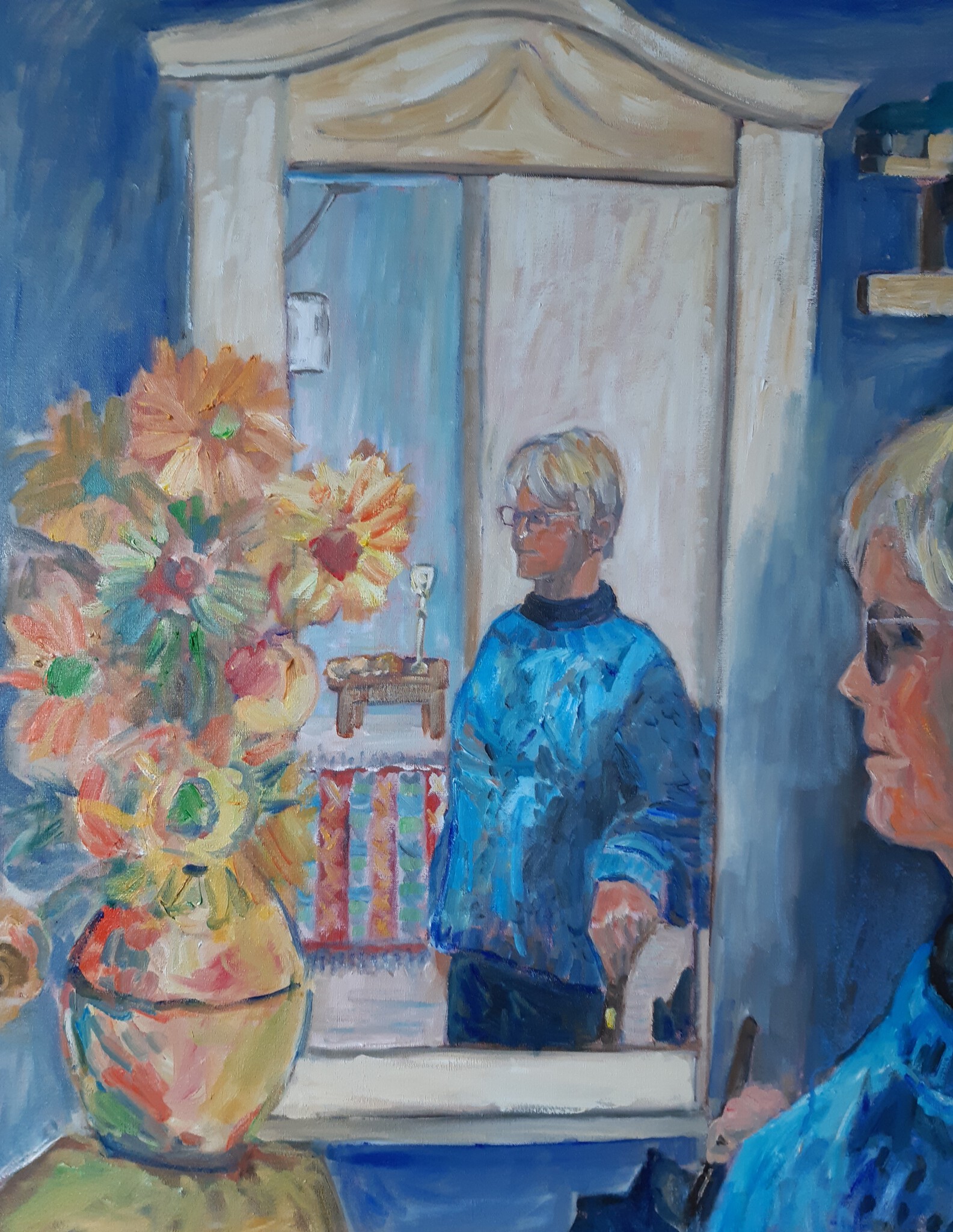 Dit portret ben ik zelf voor de spiegel.De bloemen van Van Gogh heb ik erbij verzonnen.