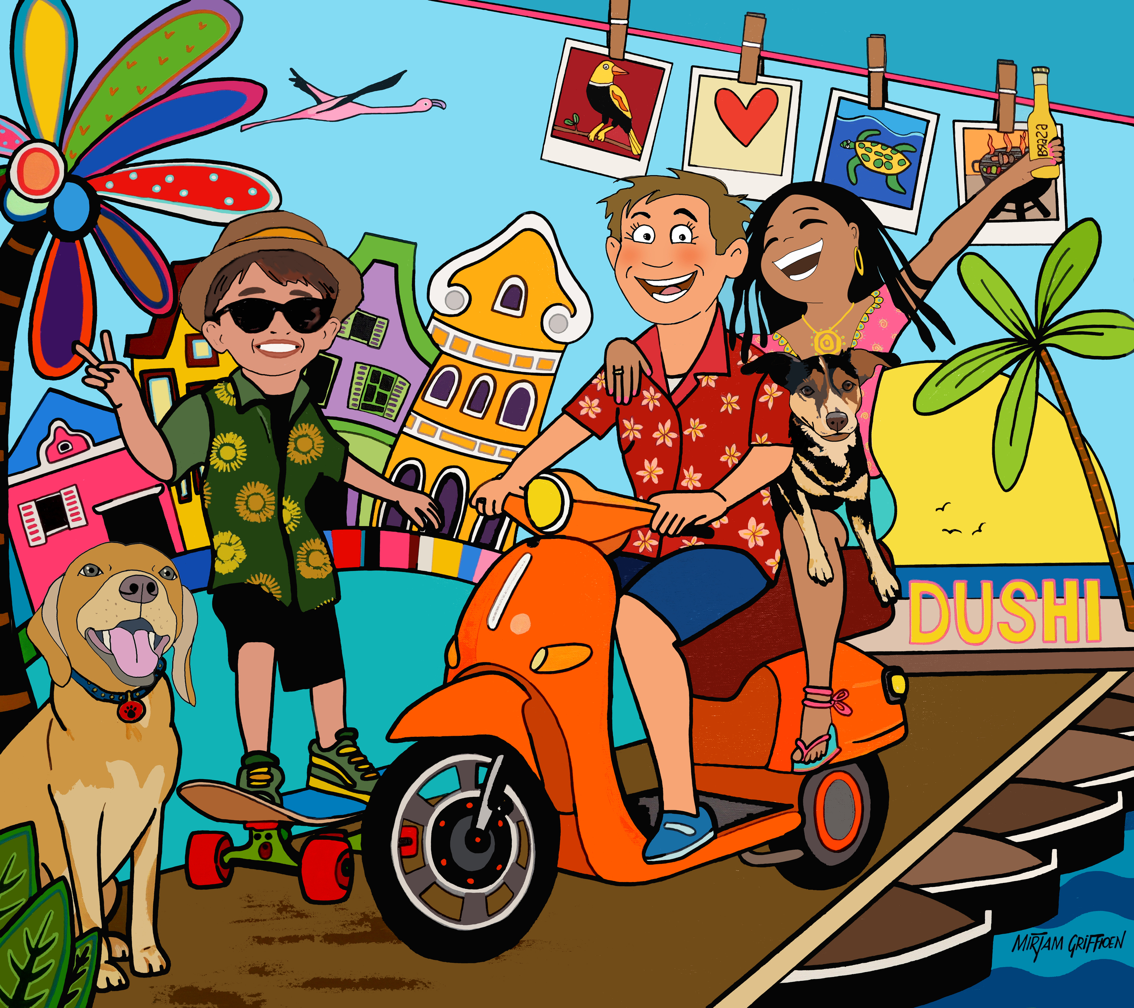 Portret Herinnering Honden Kleurrijk Familie Samen Cadeau Leven Speels Reizen Dagelijks Cartoon Groepsportret Curacao Kado Trouwen Persoonlijk Karakter Scooter Trouwkado Aandenken Mirjamgriffioenart