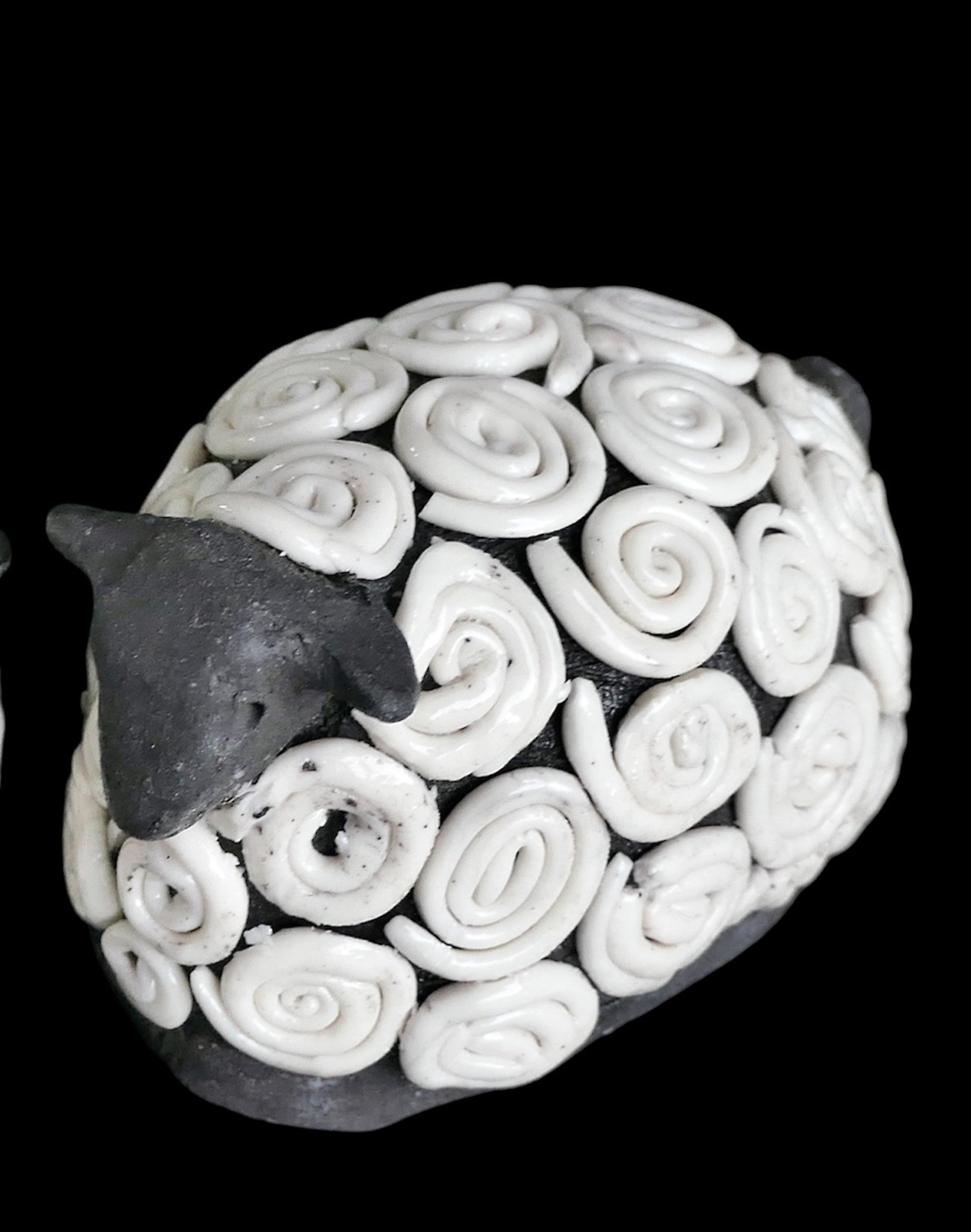 Klein schaapje van zwarte steengoed klei en wol van krullen van papier-porselein.
