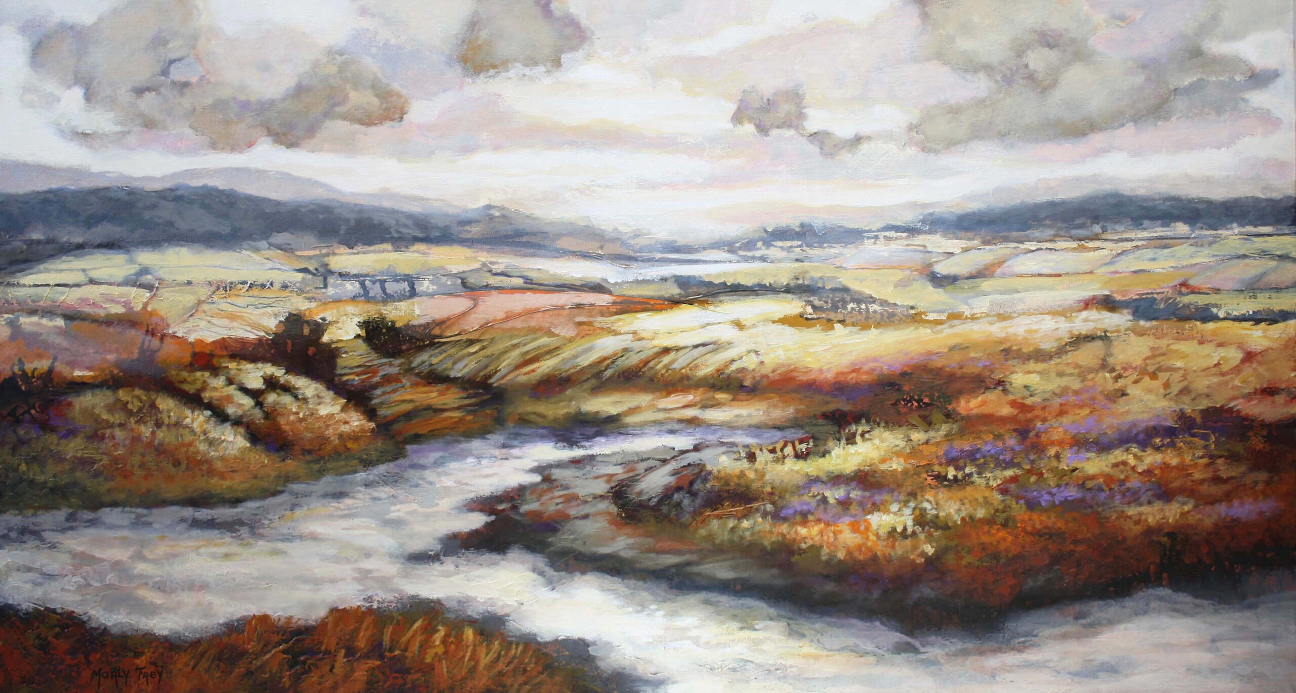 Marly Freij maakt grote kleurrijke, maar ook meer ingetogen schilderijen in gemengde techniek, met name sferische landschappen en abstracte composities