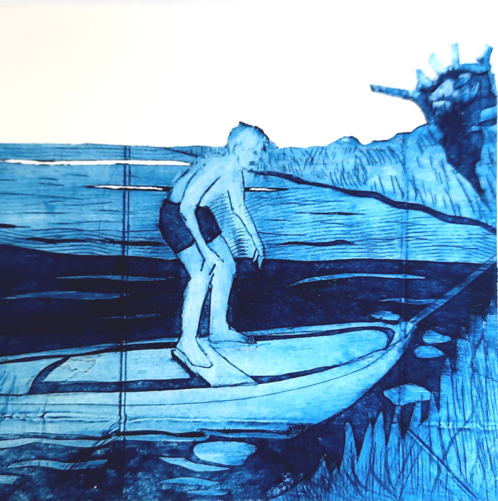 Deze tetradruk toont een hachelijk moment: Uit de boot stappen. De jongen stapt in uiterste concentratie uit de boot.