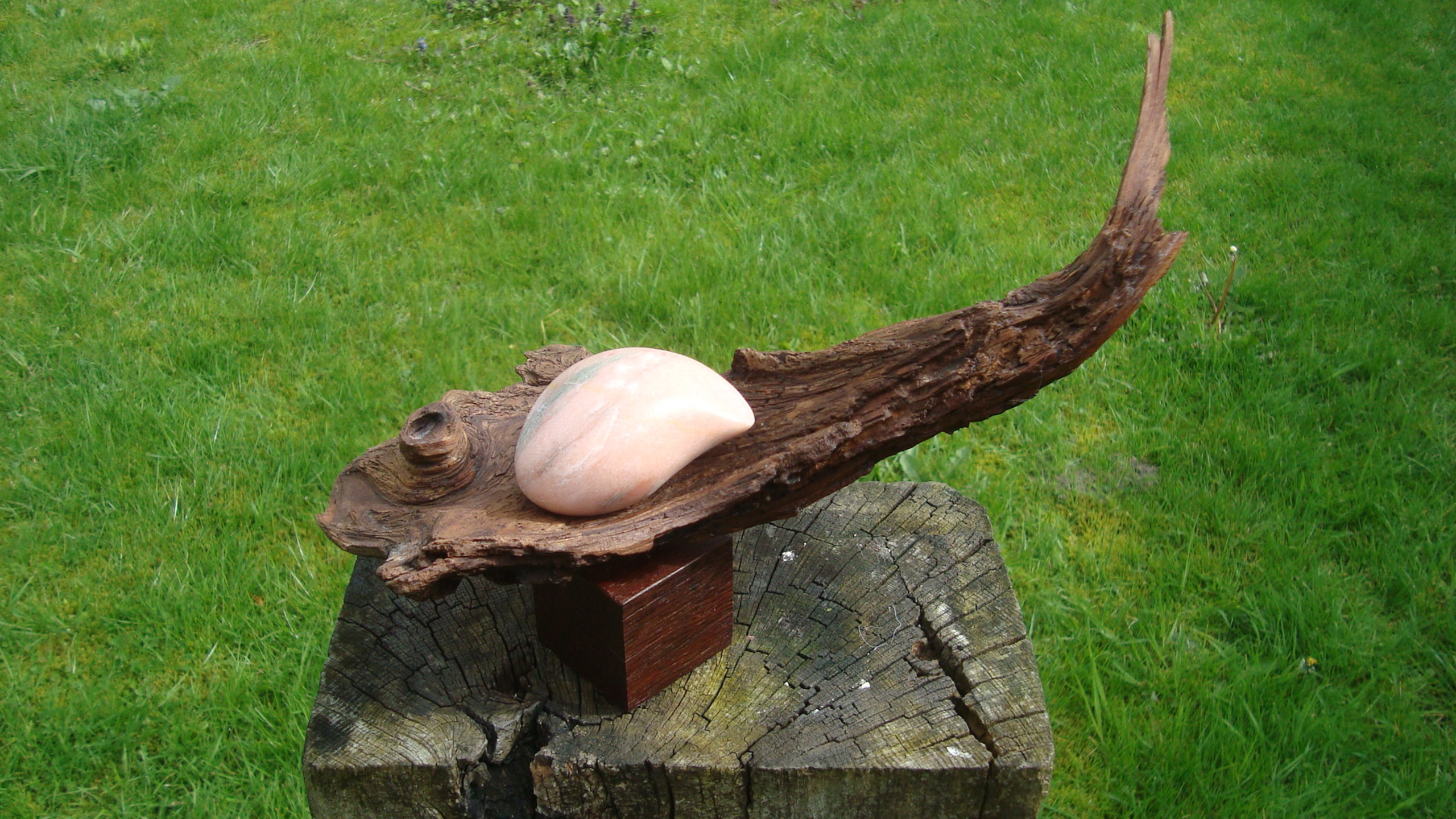 Een teder klein beeldje van een traan in Portugees Marmer, gedragen door een stuk Larixhout.