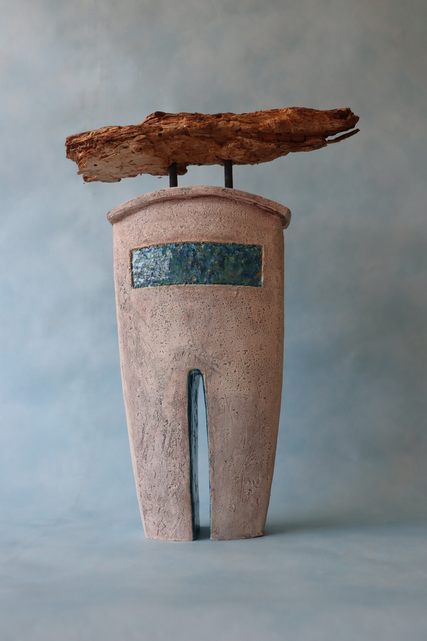 Dit object geeft door de smalle spleet de suggestie van een doorgang. Opgebouwd met plakken steengoedklei. De huid is na de 1e lage stook ingesmeerd met cobalt- en ijzeroxide De vlakken zijn geglazuurd met een structuur glazuur. Bovenop de poort is een oud stuk verweerd hout gemonteerd en wordt als het ware gedragen.