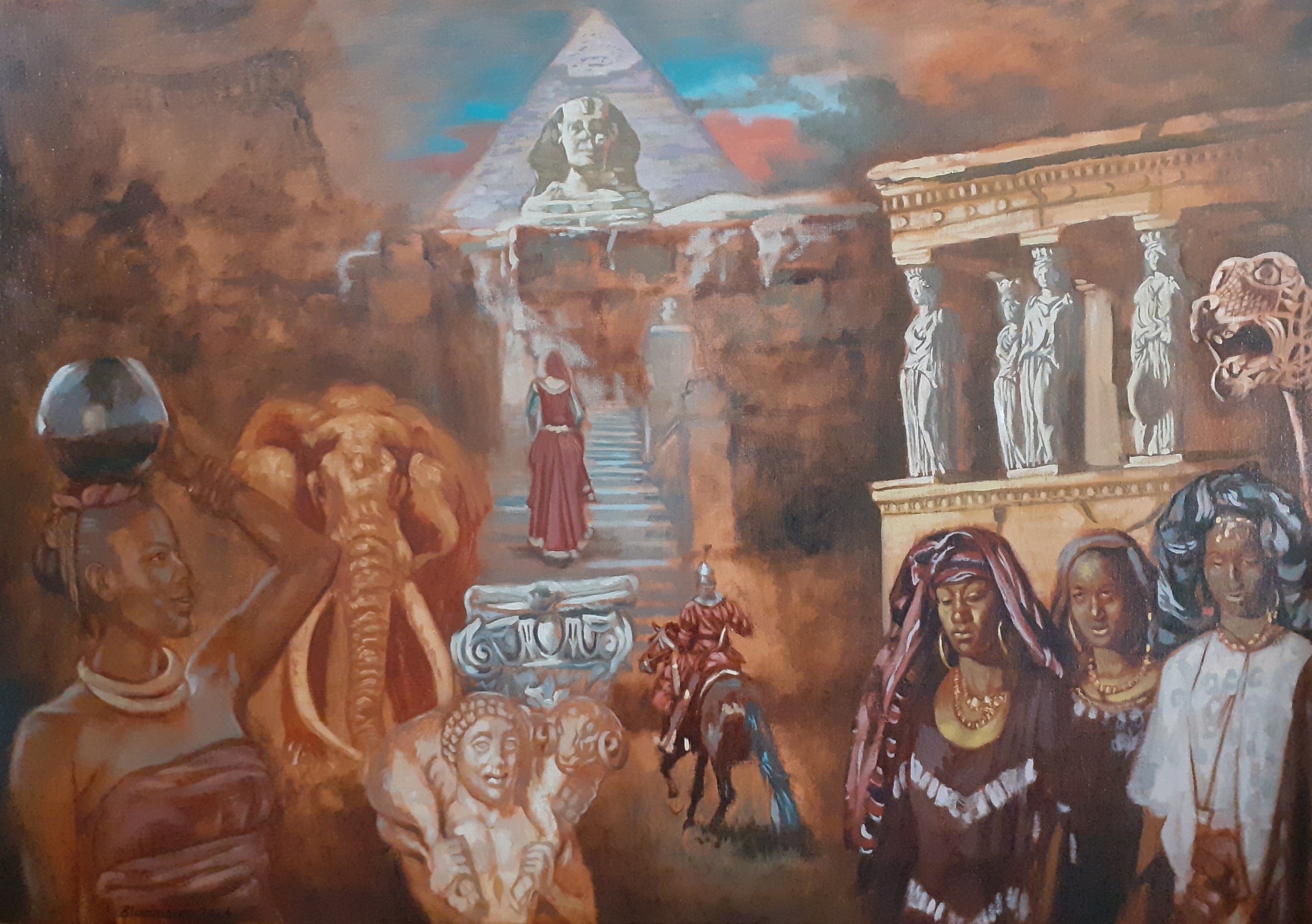 Figuratief Afrika Olifant Realistisch Olieverf Fantasie Ridder Herder Piramide Hermes Draak Oudheid Sfinx
