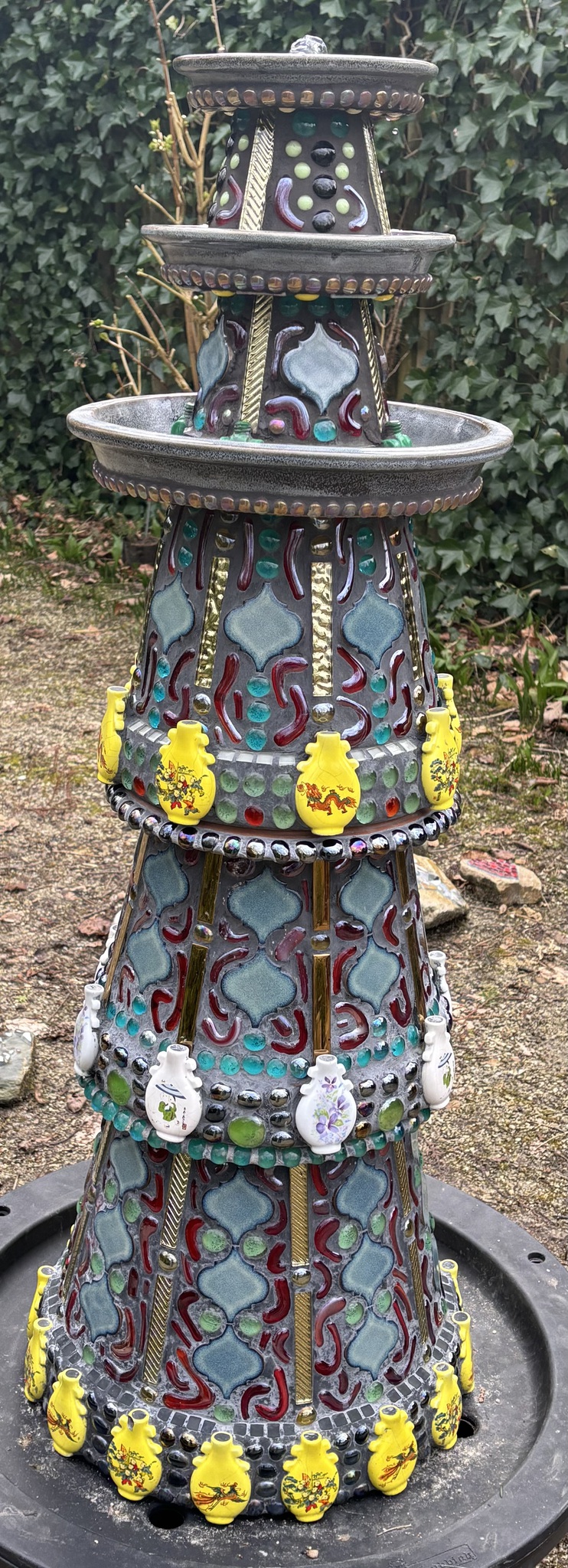 Fontein van terracotta bewerkt met keramische- en glas tegels, glas, keramische objecten en glazen objecten.