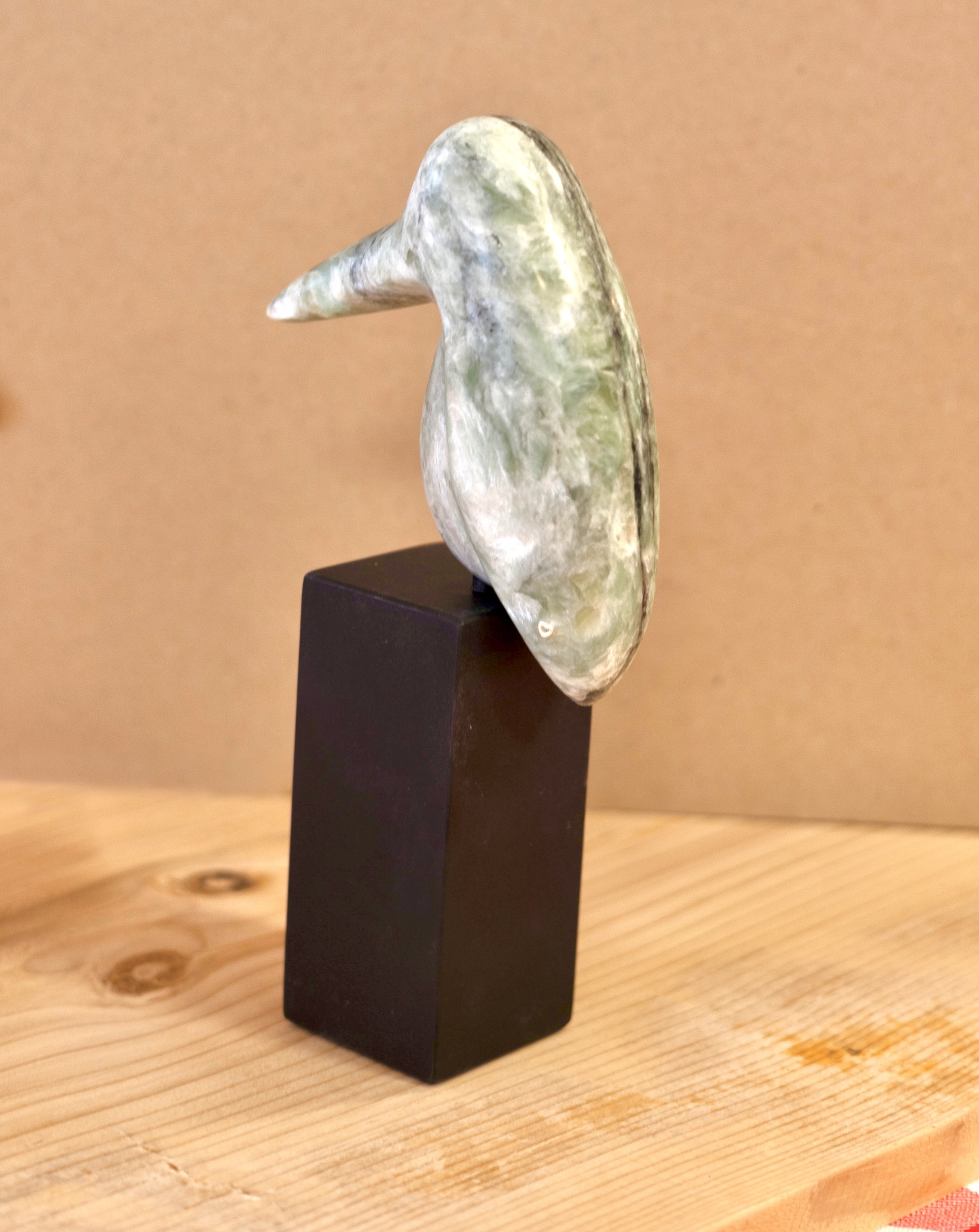 grappig getekend groen ijsvogeltje op sokkel van zwart marmer