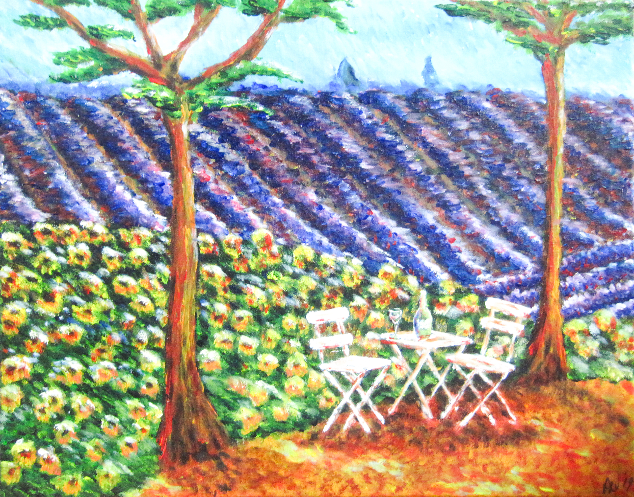 Geinspireerd door het werk van Vincent Van Gogh met zijn specifieke stijl en techniek van schilderen. Een tafereeltje wat ietwat frans aandoet.