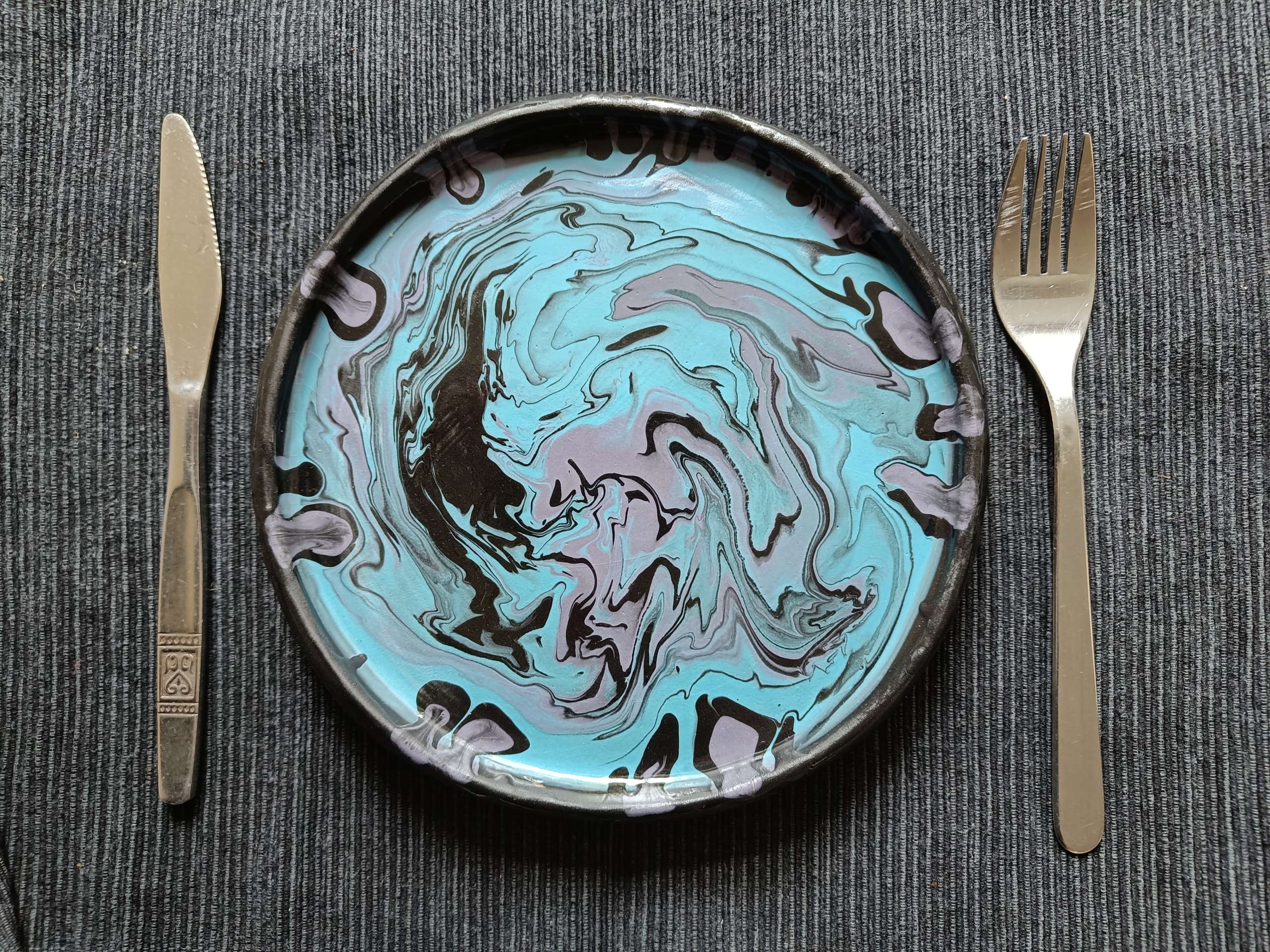 Een bordje gedraaid op de draaischijf met kleurende engobes