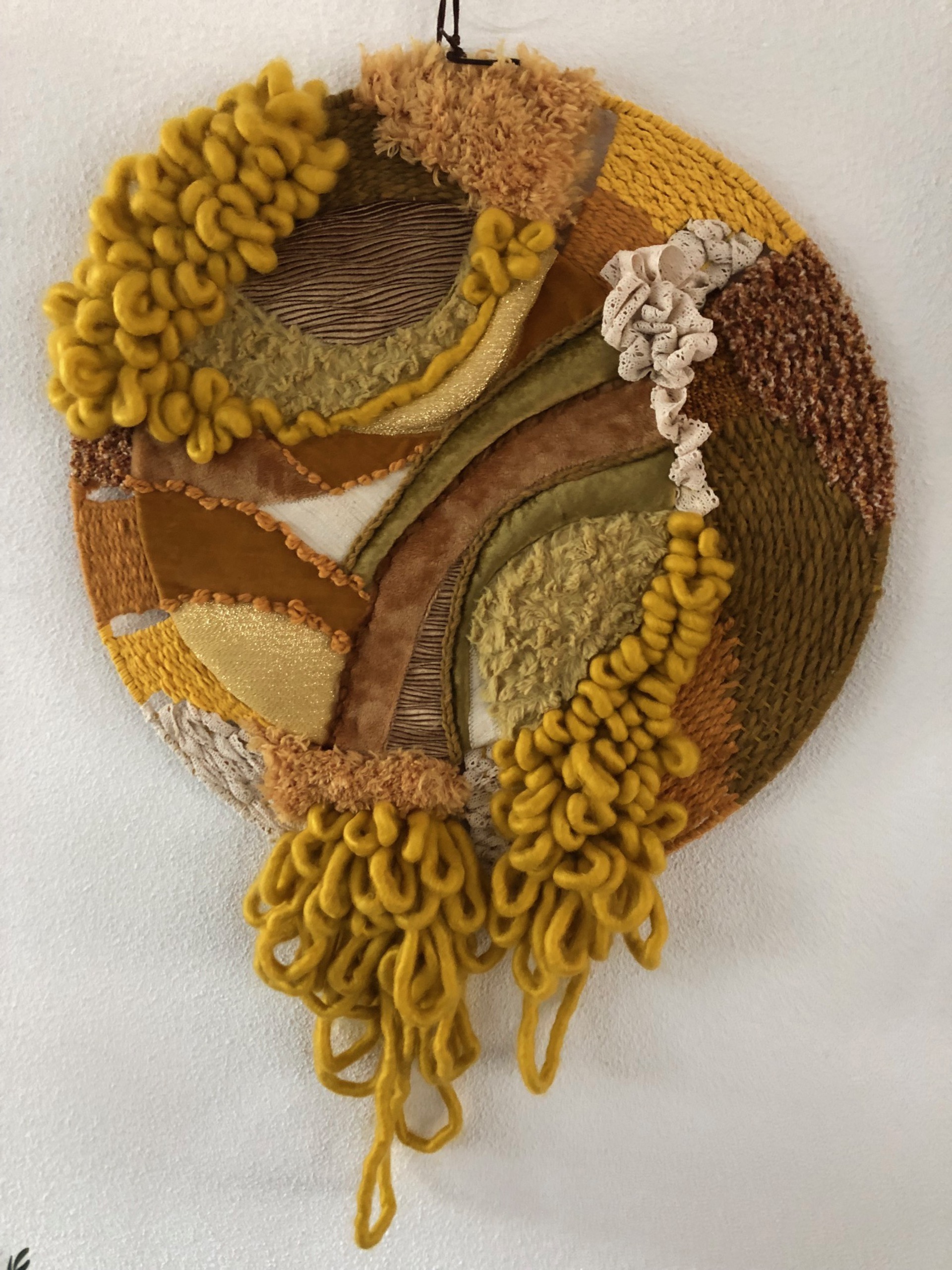 Wandkleed gemaakt met textiel en wol, combinatie van naai en weefwerk.