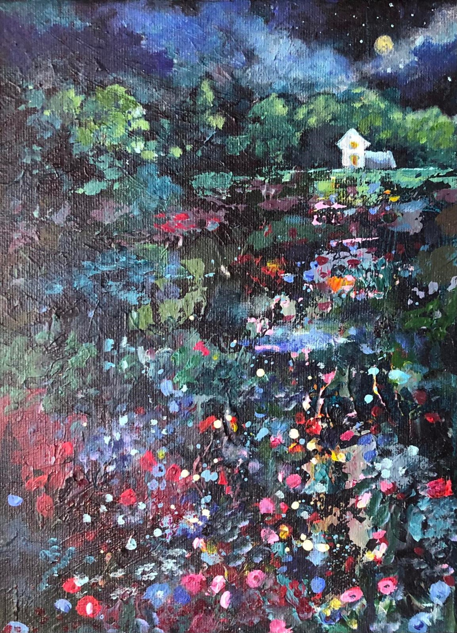 Een romantisch sfeervol schilderij in blauwe lijst