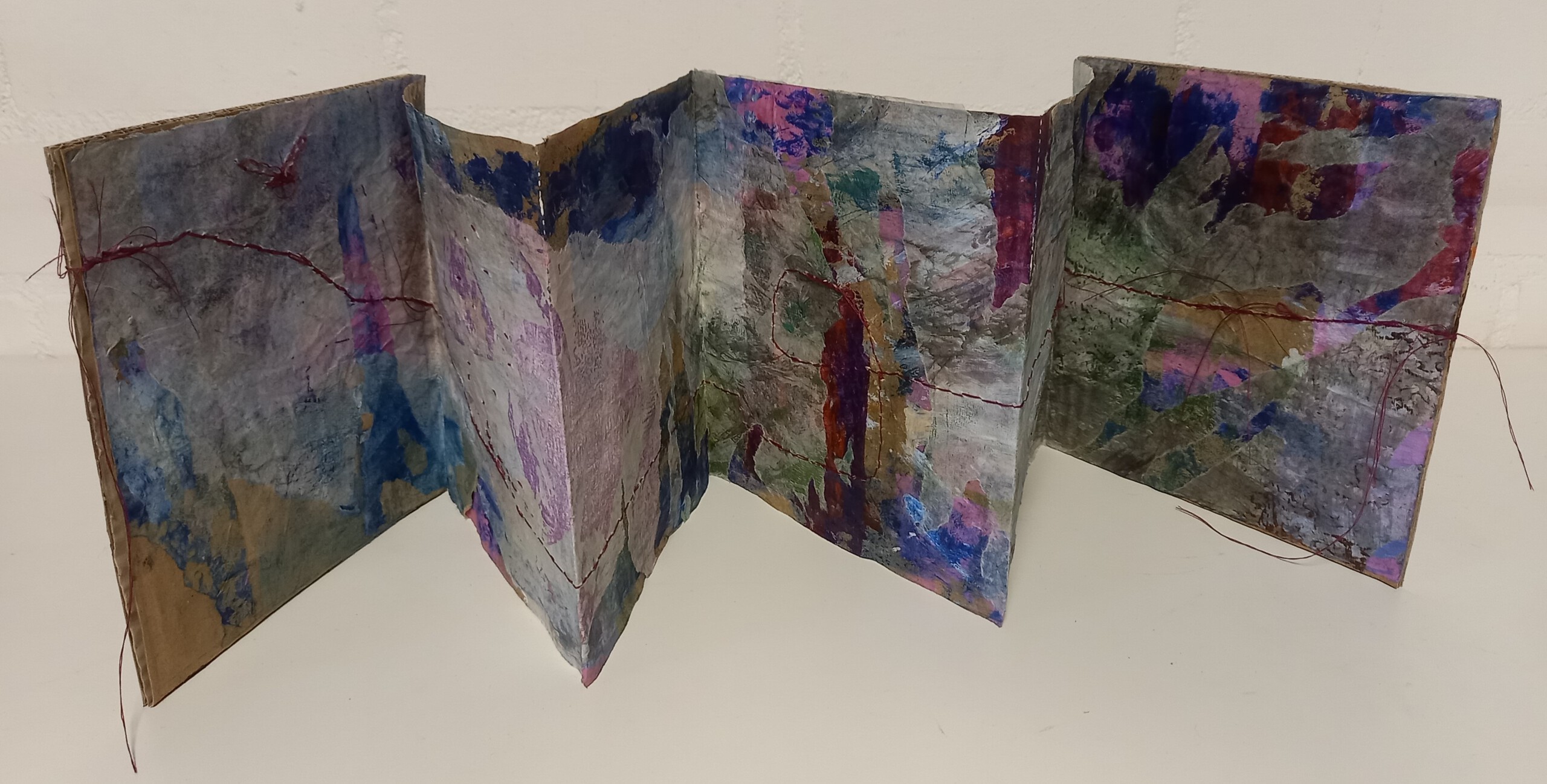 Papier met kaft in leperello gevouwen. Gebruik gemaakt van gemengde technieken, bewerkt met collage met druktechniek, acrylverf, oliepastel, stift en garen.