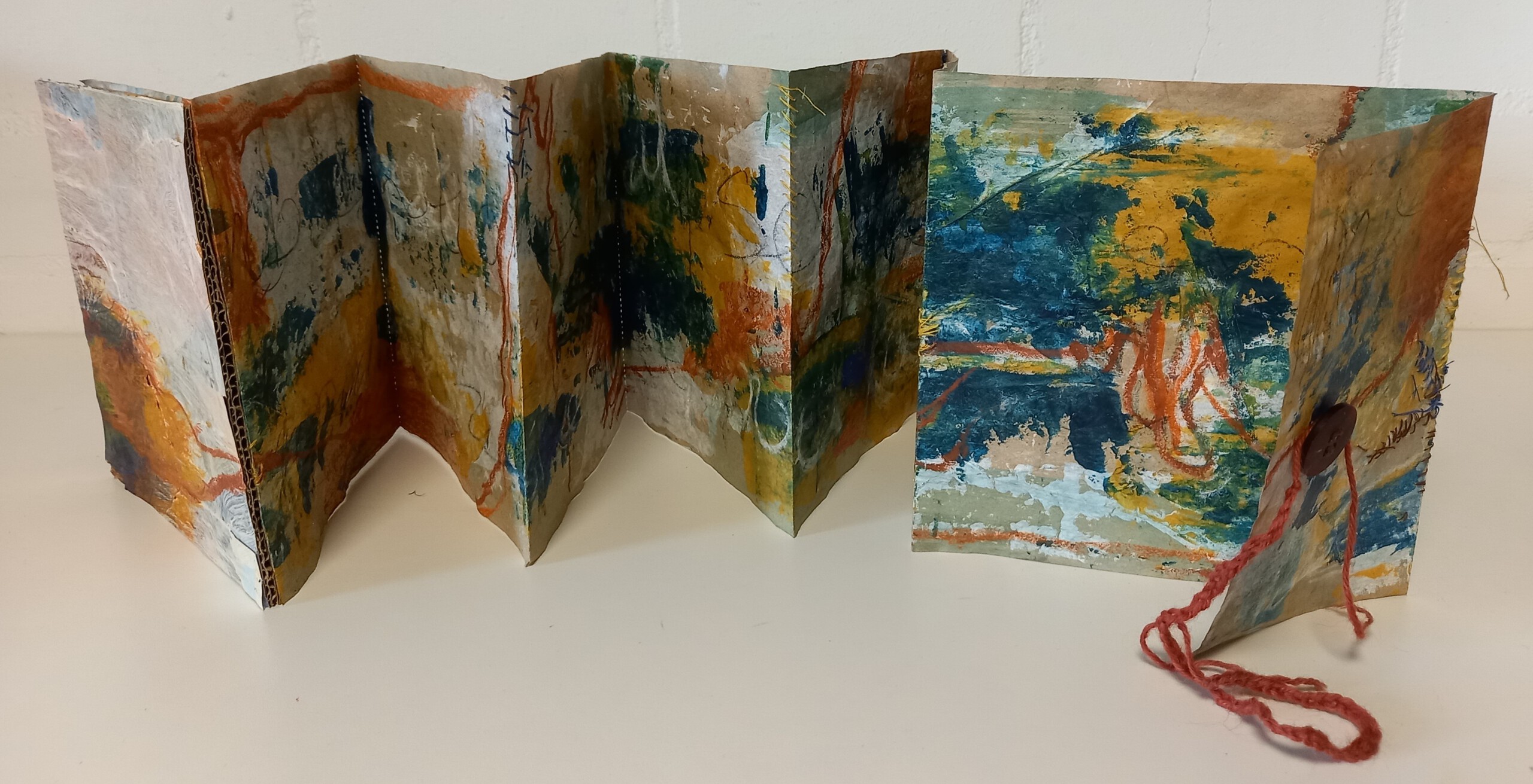Leporello van papier met aan één zijde een kaft, sluit met een knoop met touwtje. Gebruik gemaakt met gemengde technieken met acrylverf, houtskool, softpastel, oliepastel en garen