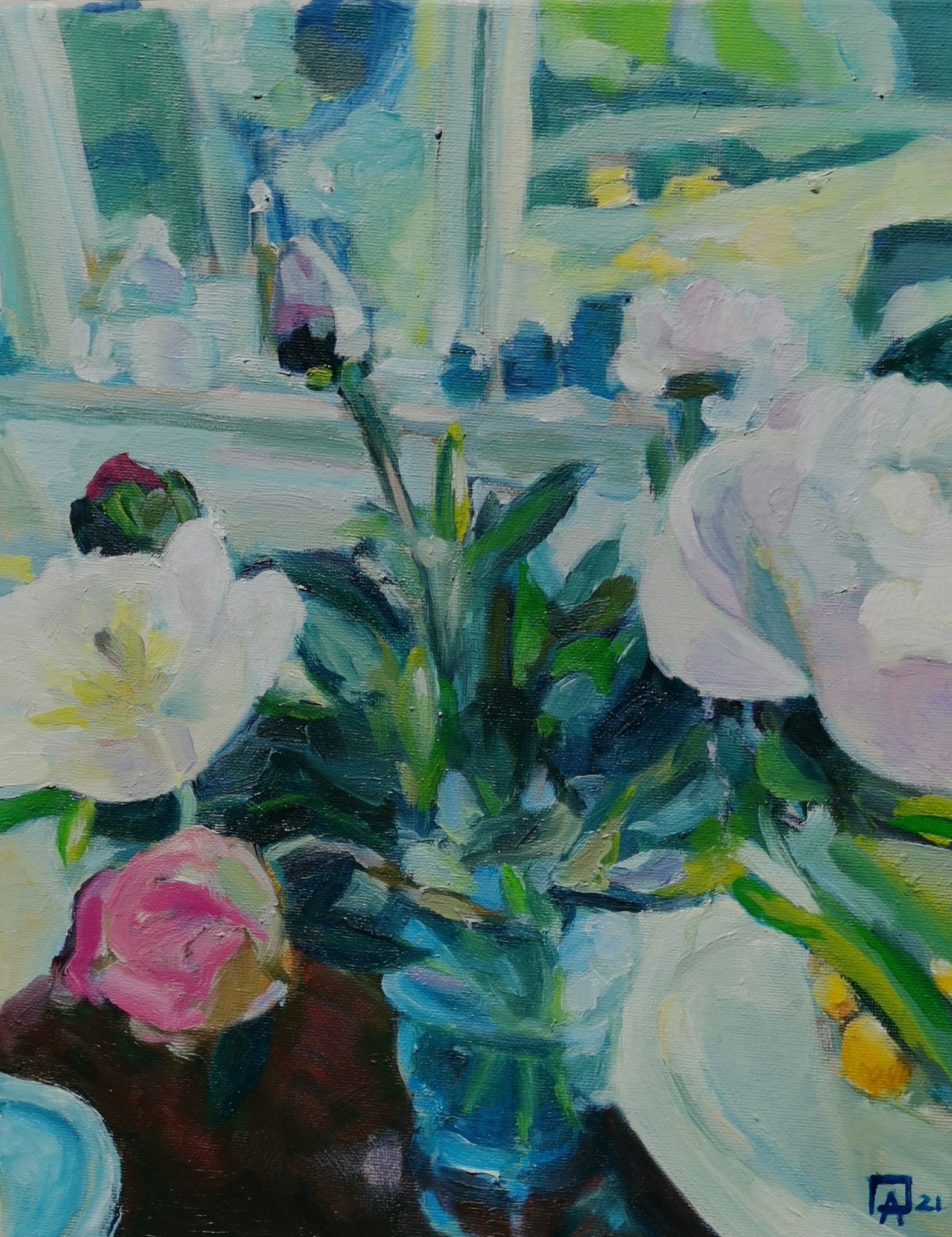 Van binnen naar buiten kijken staat centraal. Daarbij een focus op het verkennen van de diepte van kleur en de kunst van het expressief vastleggen van licht op doek.