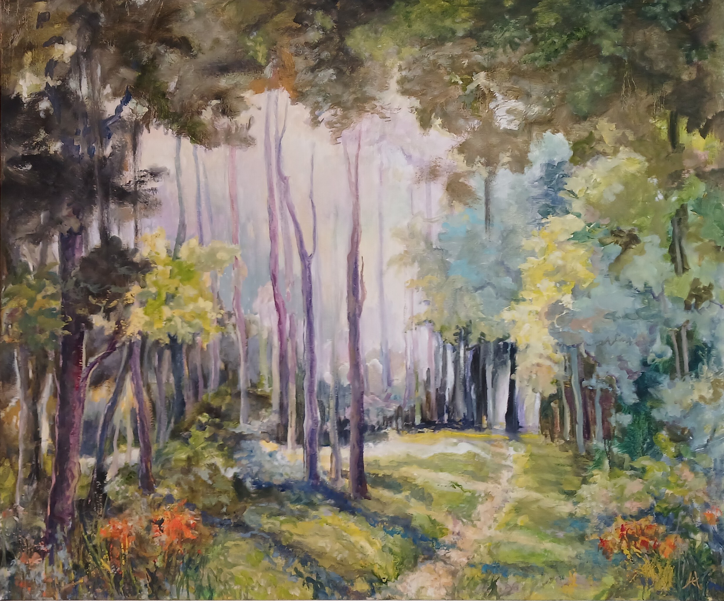 Meestal geeft het licht in mijn schilderijen kleur aan het vaak donkere bos. Deze keer heb ik gekozen voor een bos dat van zichzelf al veel kleur heeft, wat nog extra benadrukt wordt door het heldere licht, dat tussen de bomen door schijnt.