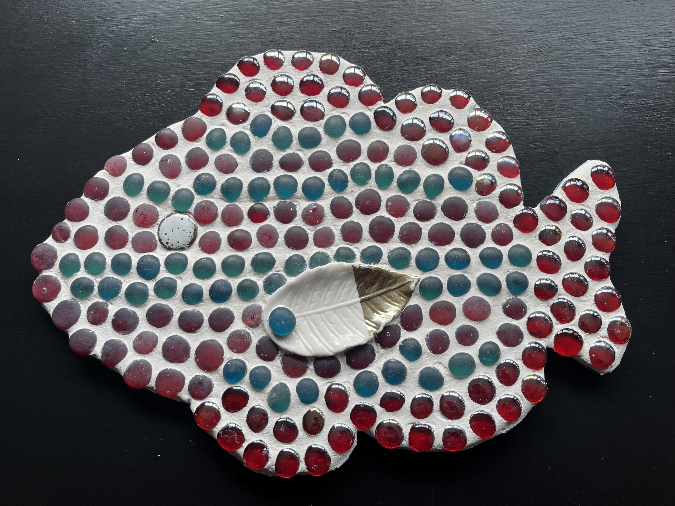Vis 4 op houten ondergrond bewerkt met keramische- en glas tegels en glas.