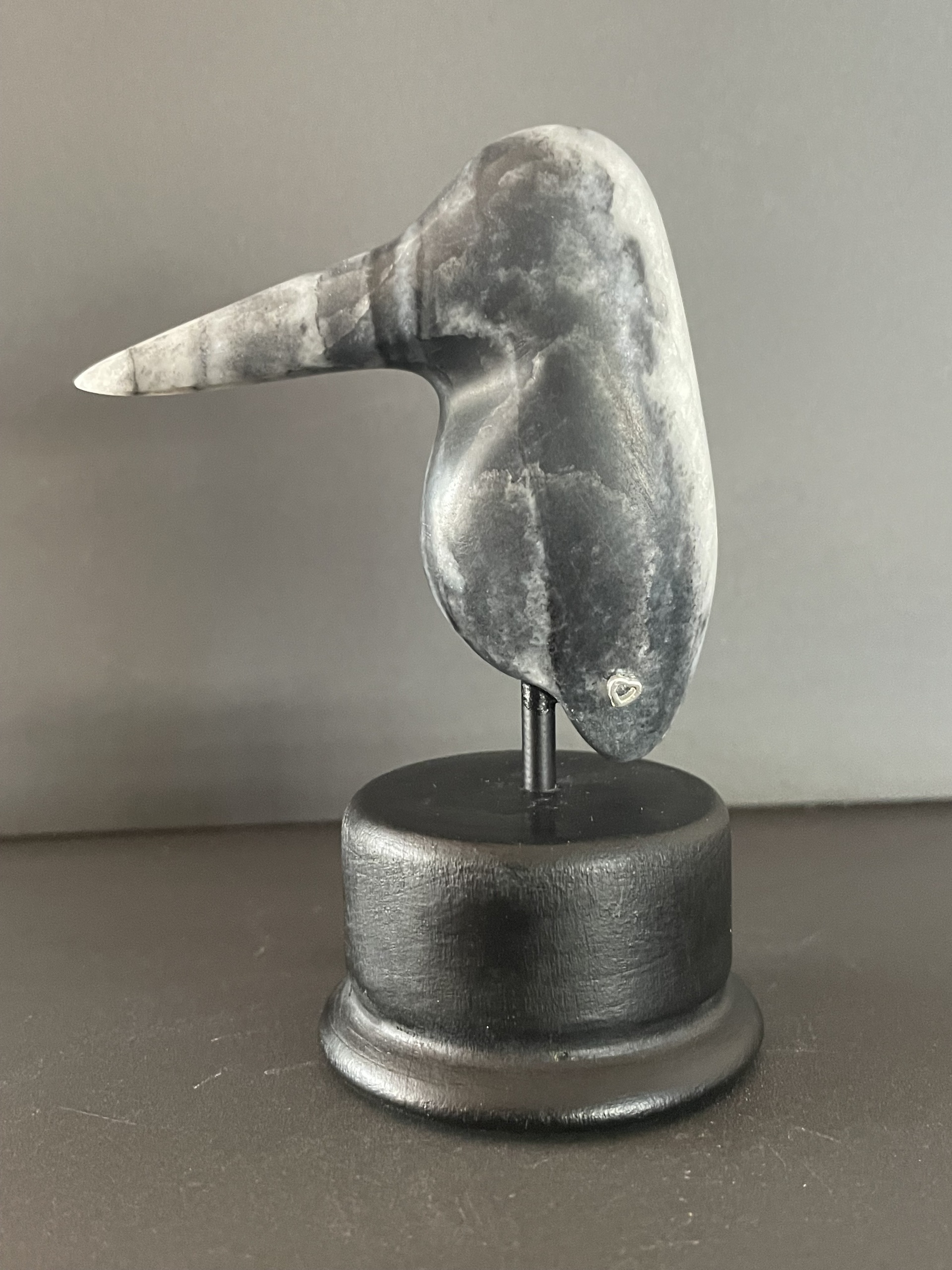 lief klein ijsvogeltje van zwart/wit Afrikaans speksteen op sokkeltje van hout