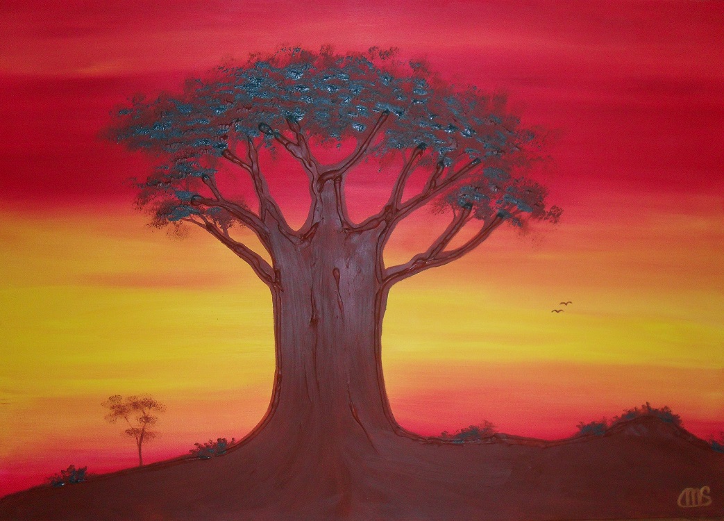 De baobab (apenbroodboom), wordt als heilige boom beschouwd door Afrikaanse volkeren (De stam en takken zijn aangebracht met verdikkingspasta zodat er meer diepte ontstaat in het schilderij).