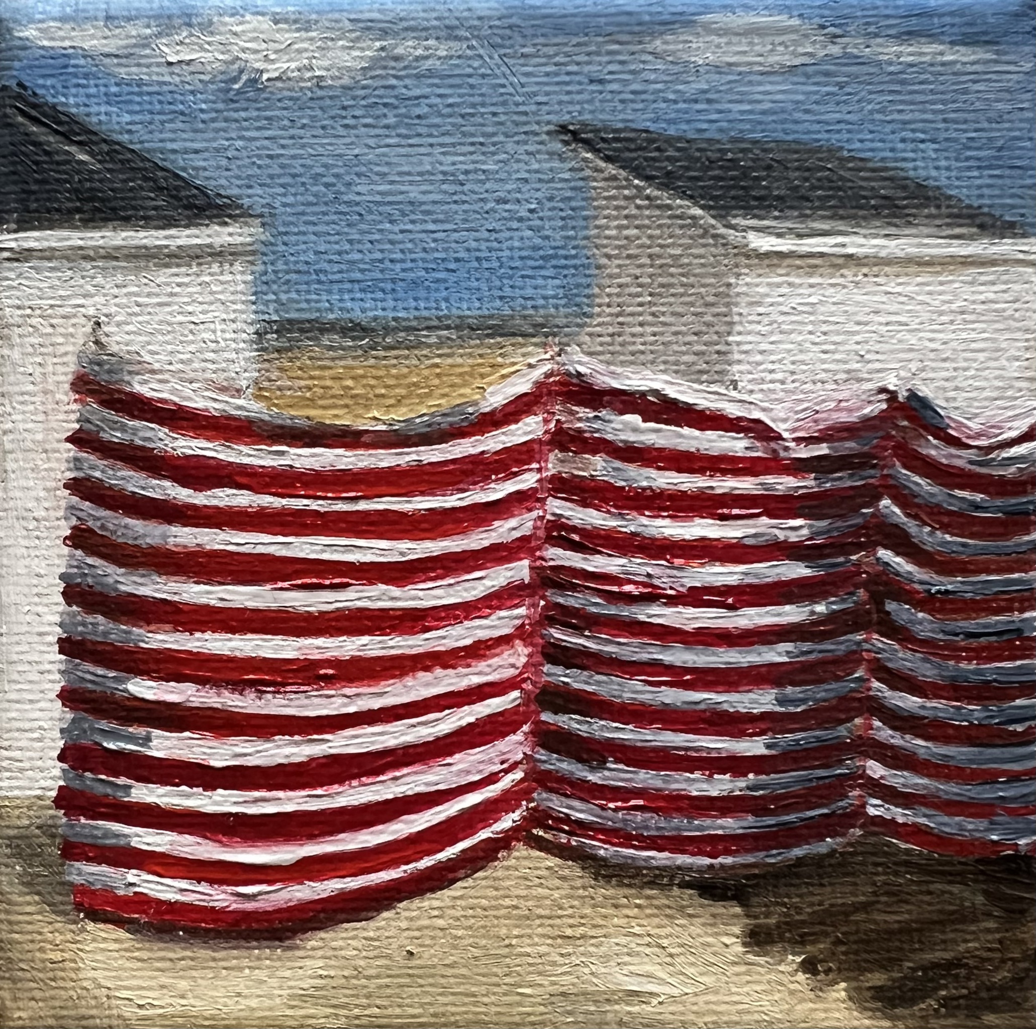 Zee Strand Realistisch Romantisch Gestreept Impressionistisch Badhokjes Minischilderij Roodwit Petitpeintre Windscherm