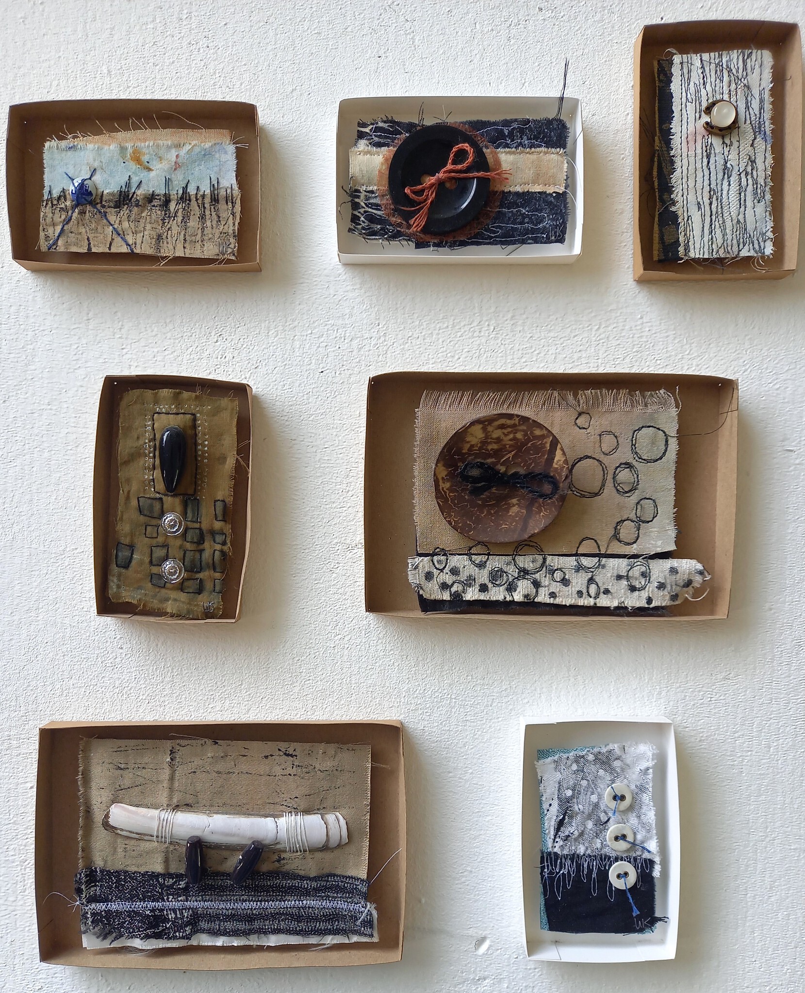 Dit zijn zeven fragmentjes van de zeventig die ik heb gemaakt. Diverse materialen maken samen deze kleine en grote 'collages'. 8 x 12 cm - 12 x 18 cm Ze worden per stuk verkocht.