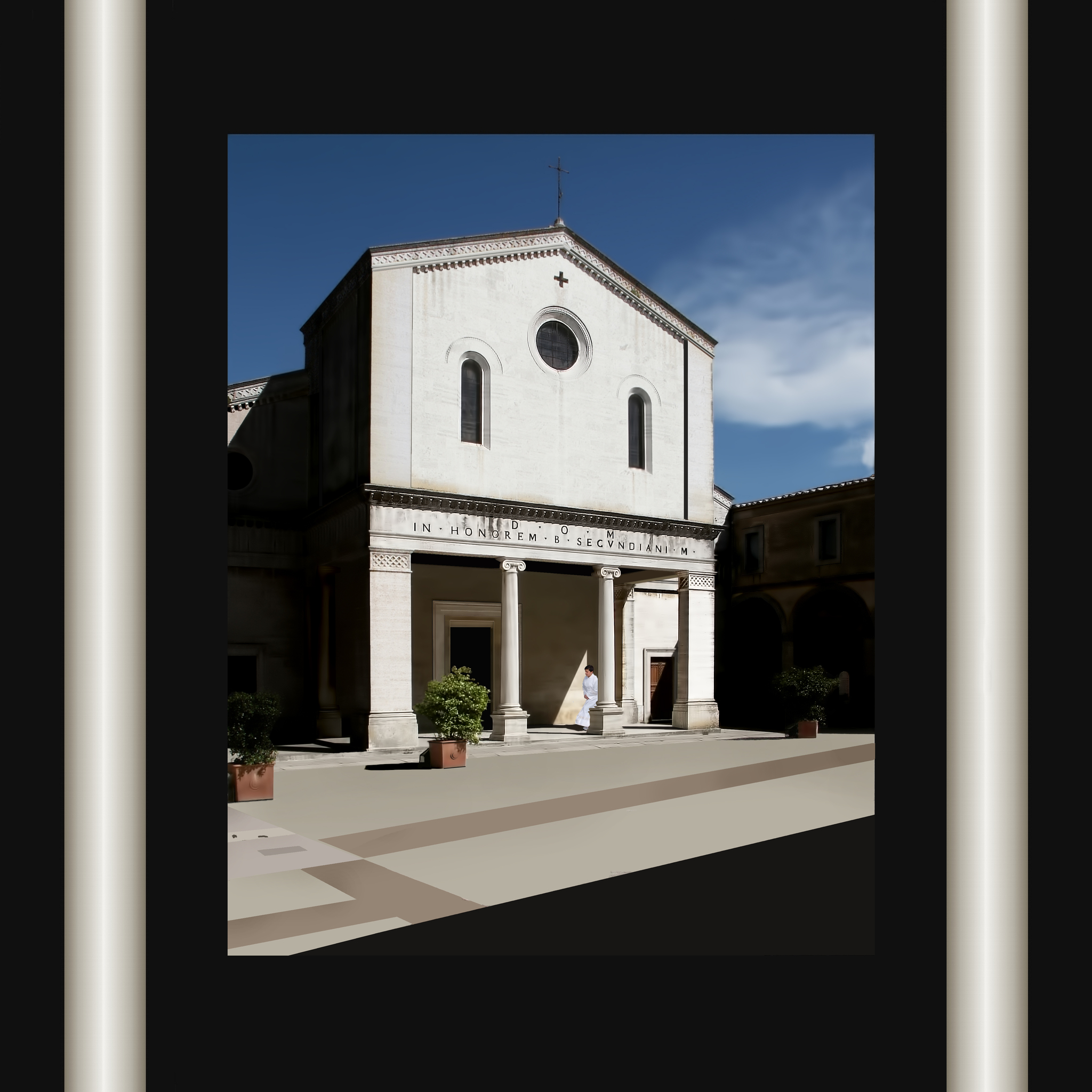 Een italiaanse kerk, realistisch, maar met een geometrisch aspect.