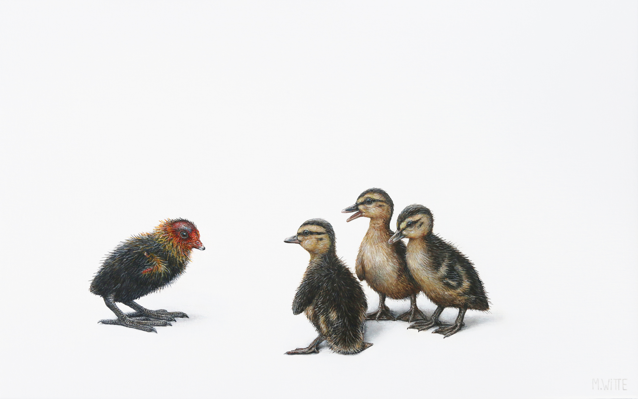 Voor dit schilderij in opdracht werd ik gevraagd om een schilderij te maken met een meerkoet. De reden was simpel: de opdrachtgever is gek van deze dieren; vooral door hun opmerkelijk grote voeten. Dit resulteerde in een idee met een baby meerkoet. Deze kuikens worden niet alleen 'geboren' met grote voeten, ze hebben ook een geweldig kostuum. in vergelijkening met kleine eendjes zijn ze misschien iets minder schattig. Ze zien er een beetje raar, vreemd, anders uit... Maar ook al zegt de omgeving soms iets anders, het is goed om anders te zijn, uniek te zijn en 'op te vallen'. Toen ik het idee voorstelde aan de klant was het mooi om haar reactie te horen. Zonder het te weten had ik voor haar een heel toepasselijk beeld gecreeerd. Geboren met rood haar, bleek 'anders zijn' het terugkerende thema in haar leven. En zo werd deze opdracht een heel persoonlijk schilderij...