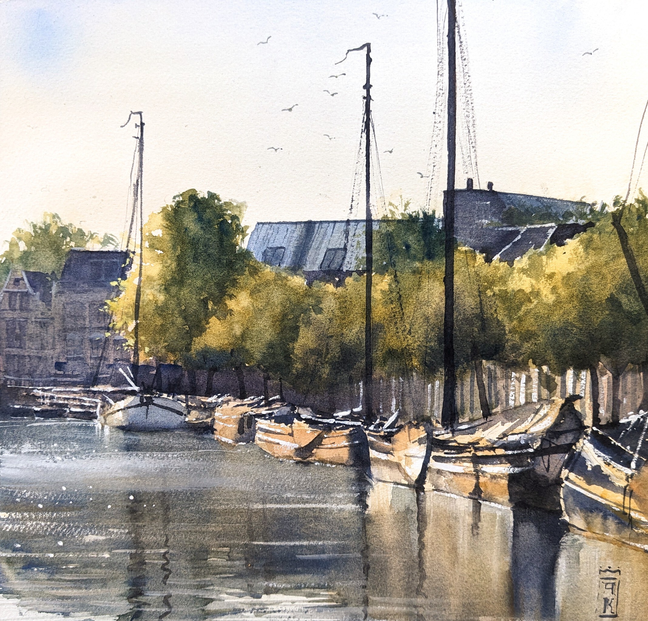 Schepen Boten Leeuwarden Friesland Ochtend Zonlicht Stad Stadsgezicht Water Boats Ships Realistisch Aquarel Schilderij Watercolor Painting Cityscape