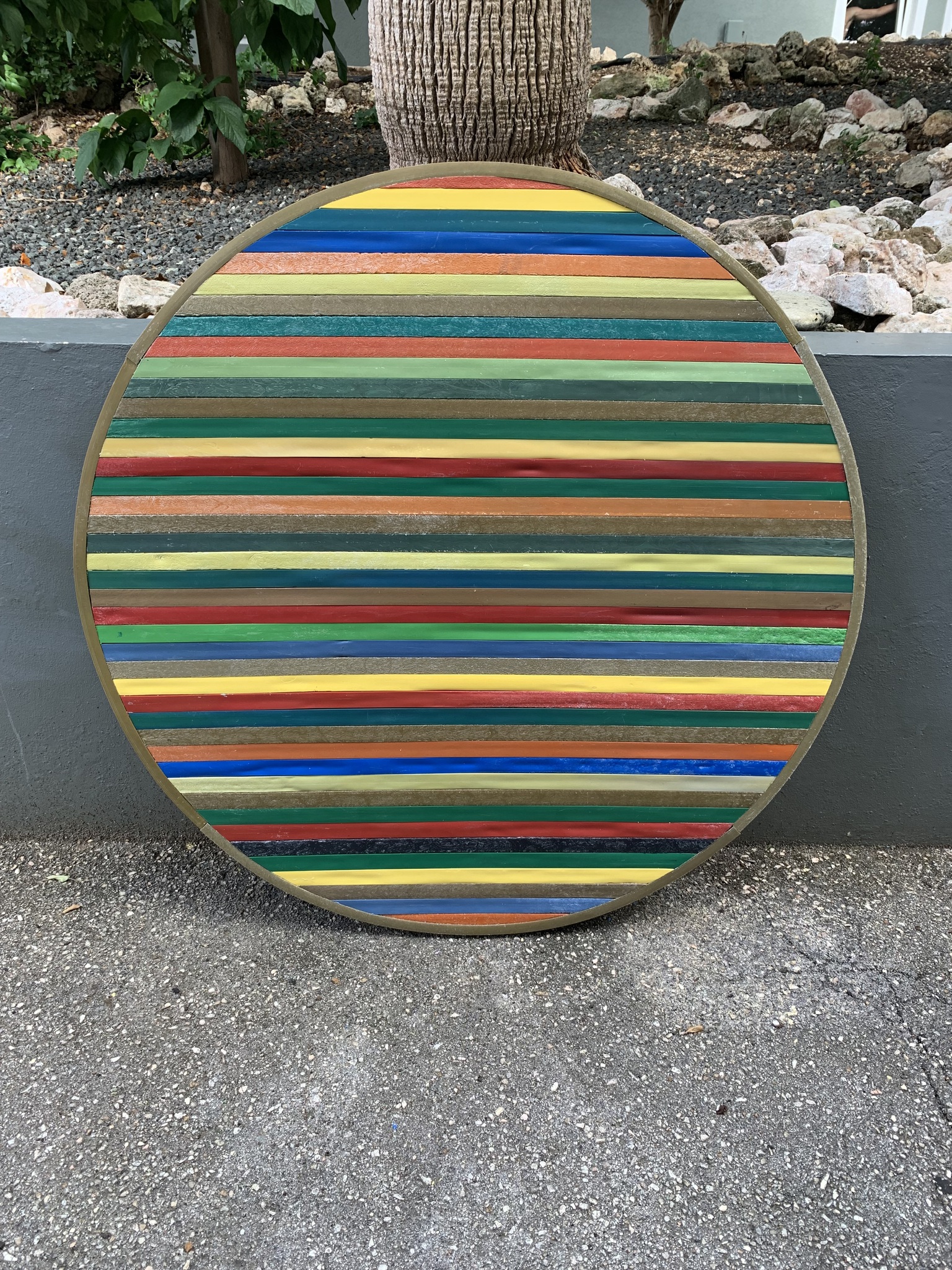 Een groot rond tafelblad van gerecycled kunststof. Als productontwerper ben ik actief voor Green Phenix, het kunststof recycle initiatief op Curacao. Dit grote tafelblad is op een bestaand metalen onderstel geschroefd en te bewonderen en als tafel te gebruiken bij restaurant Rozendaels, Willemstad Curacao