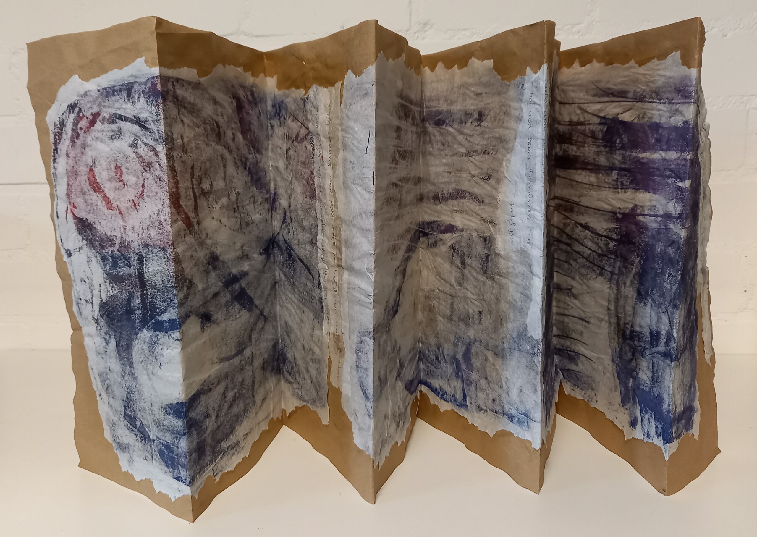 Papier in leporellovorm gevouwen, met touchdrawingtekeningen met gedichtregels eronder.