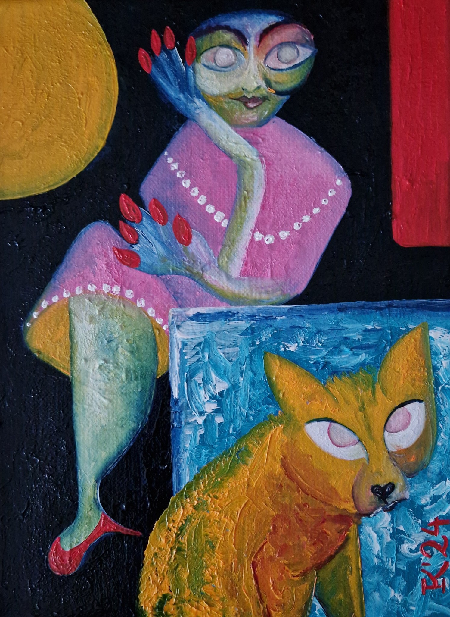 'Tafel', uit de serie 'She's mine': Olieverf op linnen, 24 bij 18 cm, geen lijst, Pictoright. Als je verliefd wordt op een vrouw met een huisdier, moet je een beetje extra je best doen. De prijs is exclusief verzendkosten. Als je je aanmeldt voor mijn gratis maandelijkse nieuwsbrief, zie linksonder bij 'contact', krijg je 10% korting bij aanschaf van dit werk. De prijs is zonder verzendkosten. ‘Table’, from the series ‘She’s mine’ oil paint on linnen, 24 x 18, no frame, Pictoright. When you fall in love with a woman with a pet, yoy have to make a little extra effort. If you sign up for my monthly free newsletter, see bottom left under 'contact', you will receive a 10% discount when purchasing this work. The price does not include shipping costs.