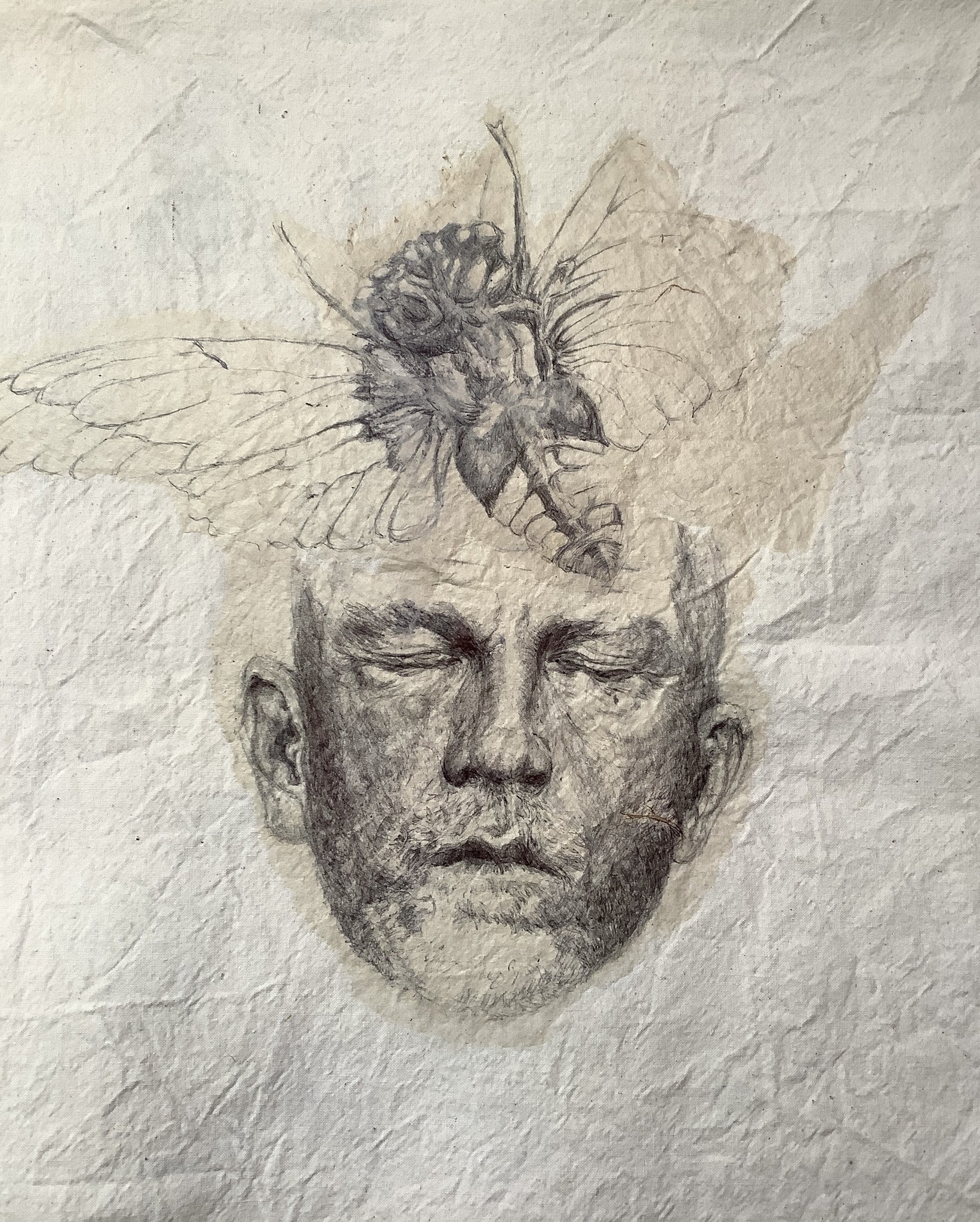 Als de biodiversiteit afneemt, hoe overleven wij dan als mens? ballpoint tekening op rijstpapier/ katoen
