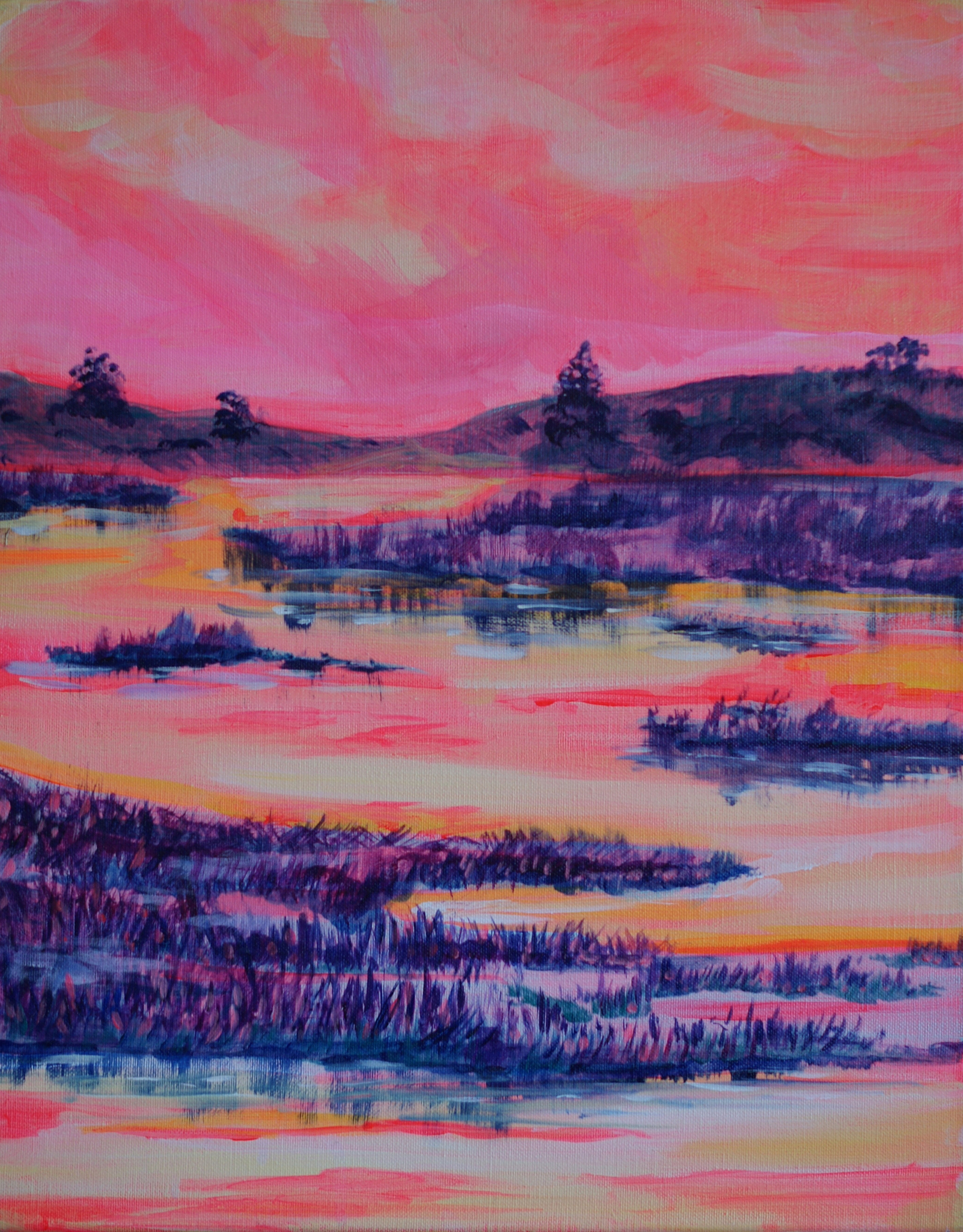 Oranje Landschap Water Kleuren Natuur Felle Acrylverf Roze Neon