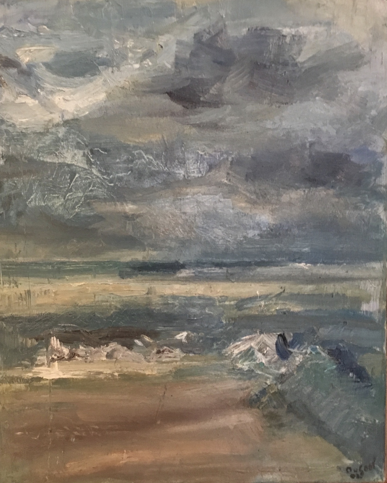 Aan het strand geschilderd toen er onweer op kwam zetten. De lucht werd steeds donkerder,het zand waaide over mijn schilderij.Helaas voortijdig moeten vertrekken.Dit was tijdens een schildersvakantie in Bredene in België