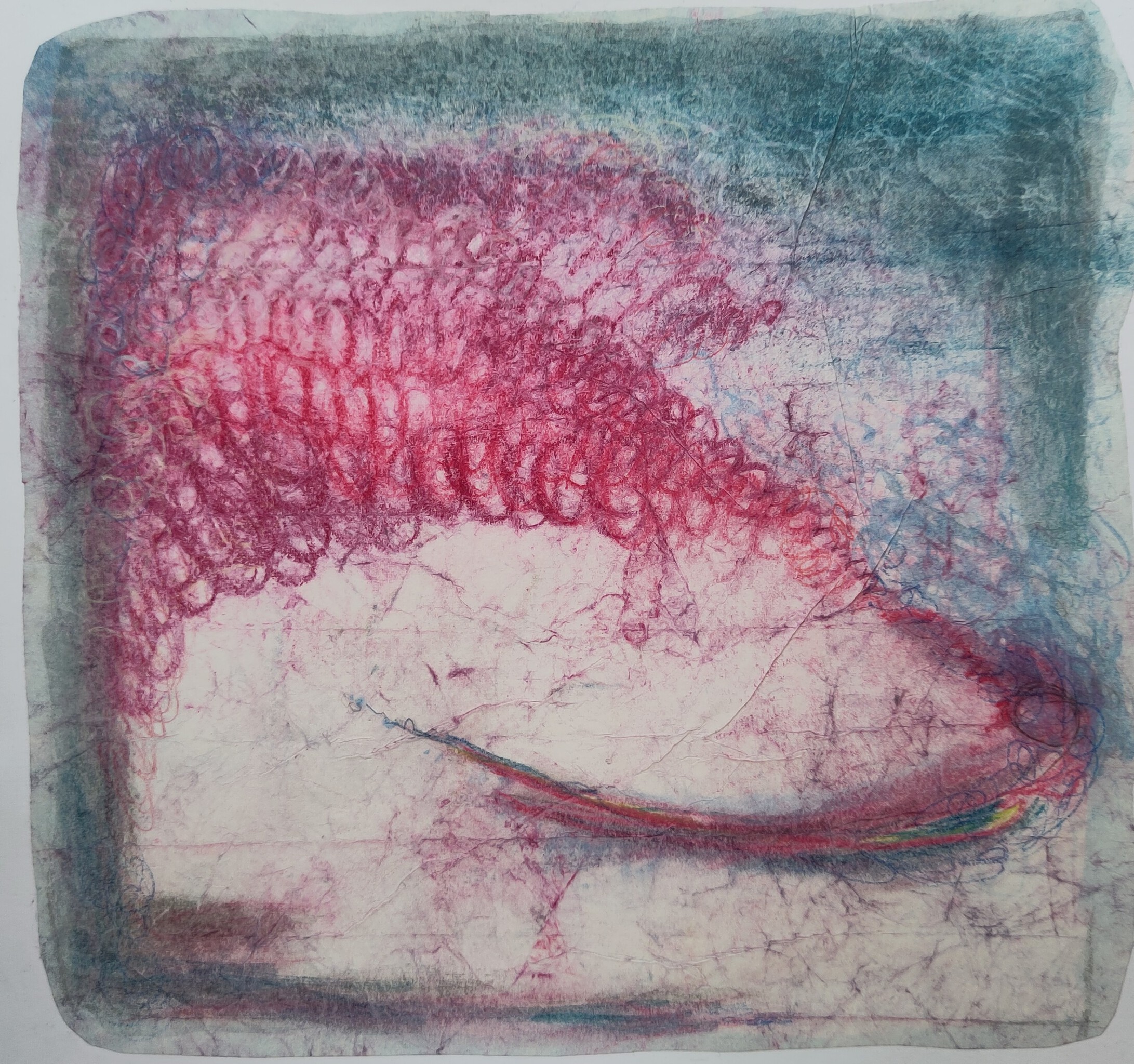 In 2007 mee begonnen. Laag over laag. Aanleiding was een foto van een eigen tekening. En nu is ie af. Op rijstpapier, met potlood, aquarel potlood en softpastelpotlood. Papier opgestreken en geplakt op dikker papier.
