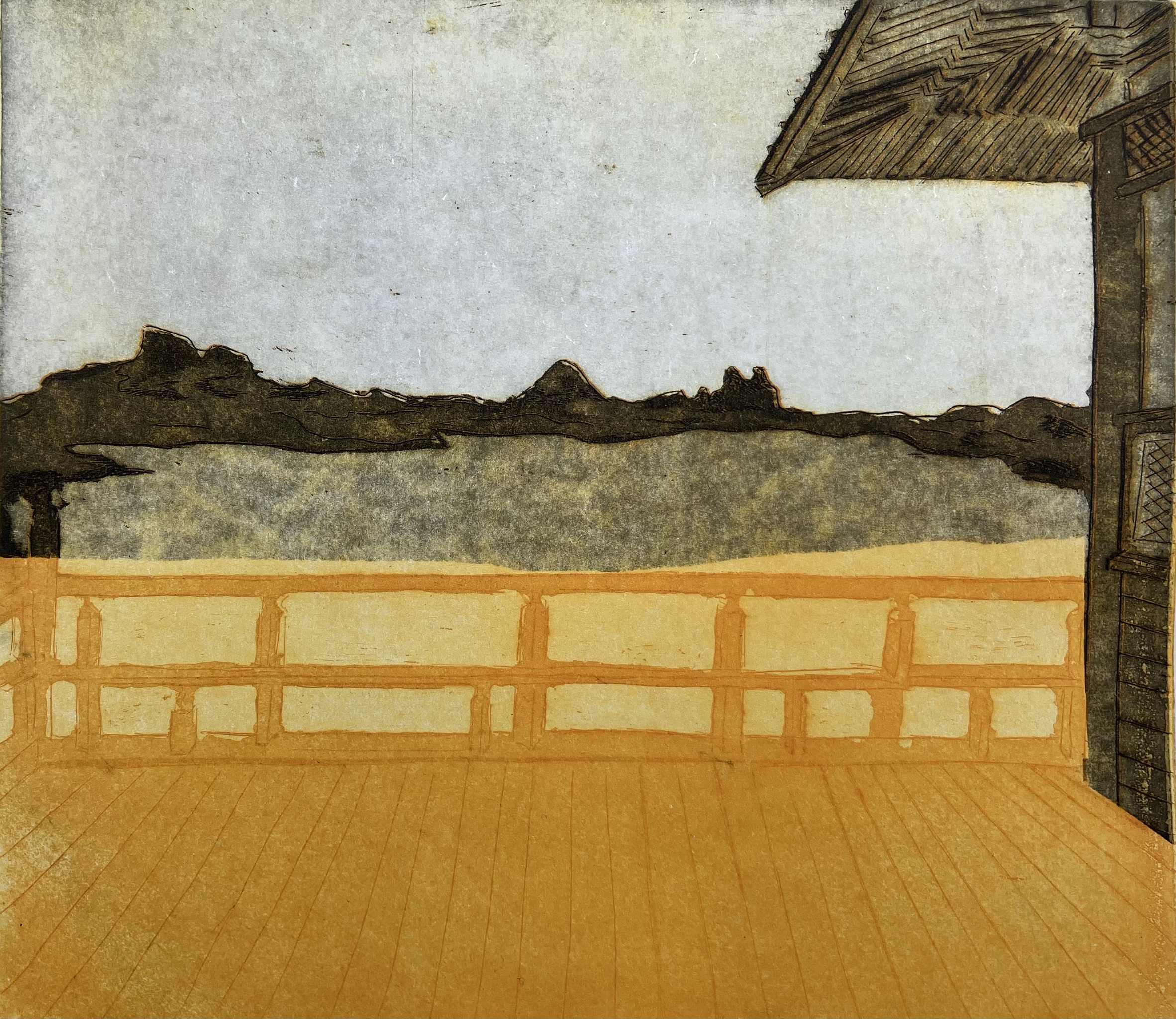 Ook met de houtsnede als uitgangspunt maar nu een ets in twee kleuren